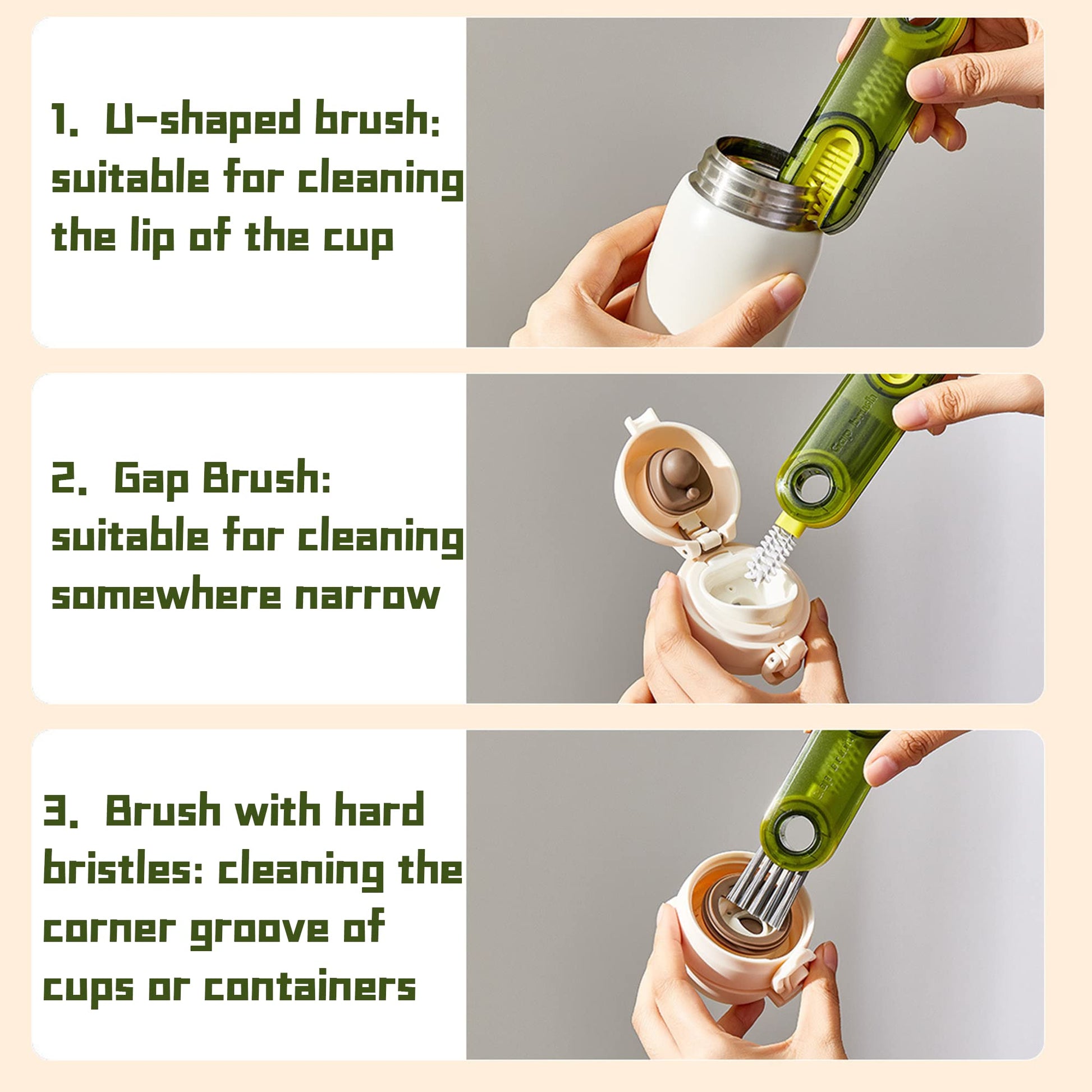 2Pcs 3-in-1 Cup Lid Cleaning Brush Set,Multifunctional Bottle Cover Detail Brushes, Kitchen Cleaning Tools for Various Containers,Portable & Space-Saving,Two Colors