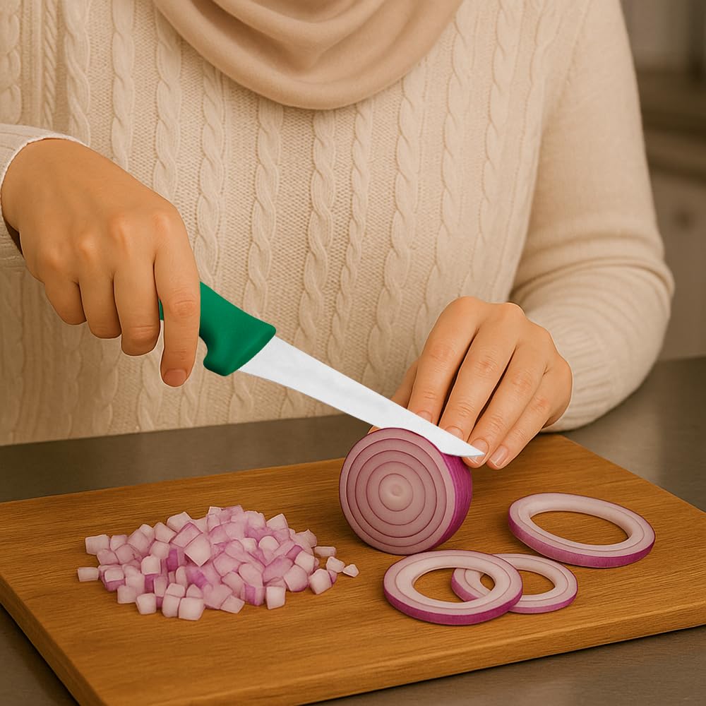 • تحتفظ الشفرة الحادة المصنوعة من الفولاذ المقاوم للصدأ بحافتها لفترة أطول، مما يجعلها مثالية للتقطيع والتقطيع إلى مكعبات والتقطيع ومجموعة متنوعة من مهام المطبخ اليومية.