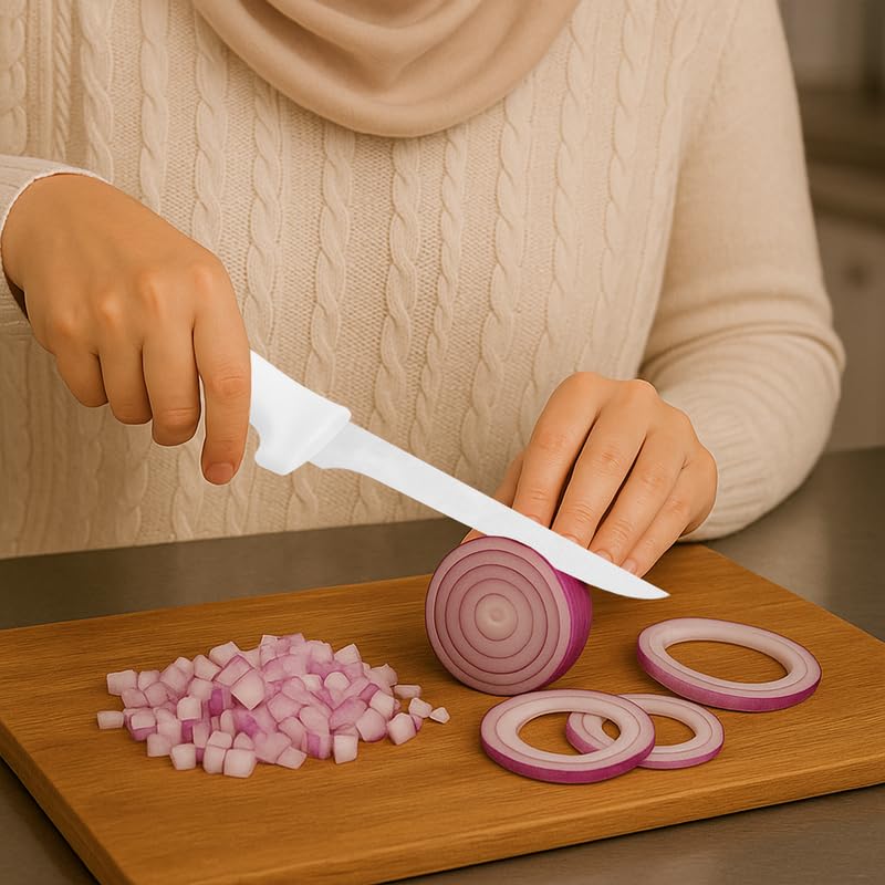 • تحتفظ الشفرة الحادة المصنوعة من الفولاذ المقاوم للصدأ بحافتها لفترة أطول، مما يجعلها مثالية للتقطيع والتقطيع إلى مكعبات والتقطيع ومجموعة متنوعة من مهام المطبخ اليومية.