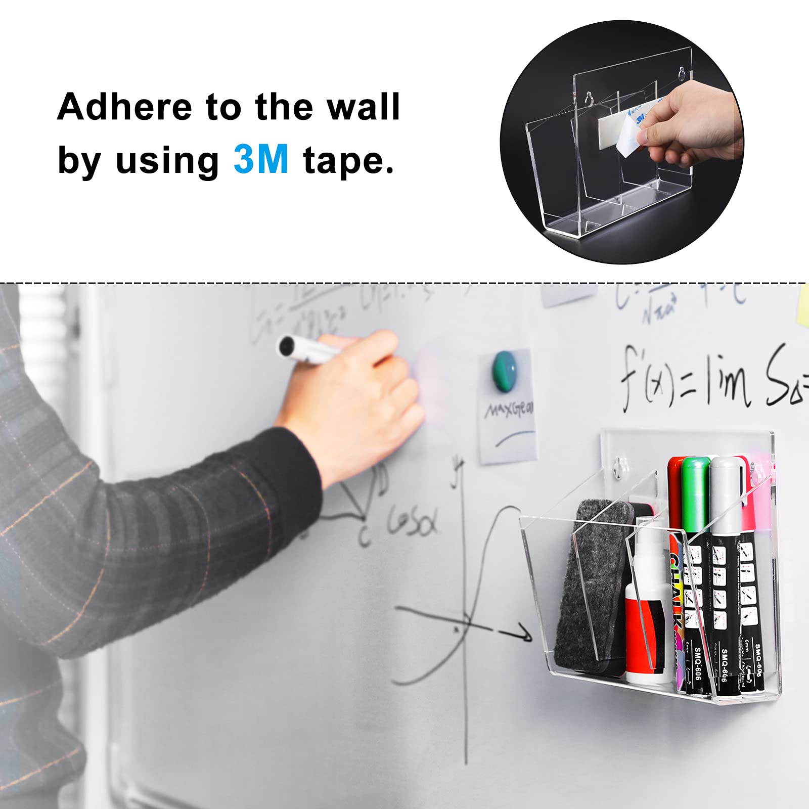 حامل أقلام أكريليك، منظم مثبت على الحائط مع 3 حجرات، لأقلام المسح الجاف، والسبورة البيضاء، وإكسسوارات الفصول الدراسية والمكتب، يتضمن لاصقًا، شفاف