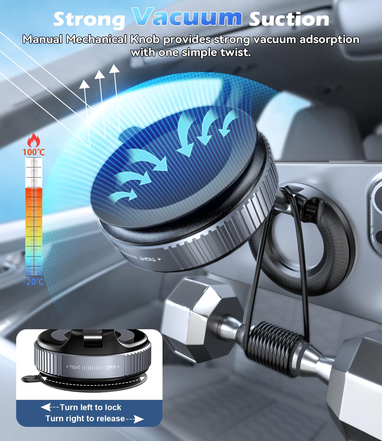 • Strong suction effects: this car phone holder can be firmly attached to any smooth surface in just a few simple steps by placing it and turning the mechanical knob. It can also be used on rough surfaces by first applying the smooth base plate that is included.