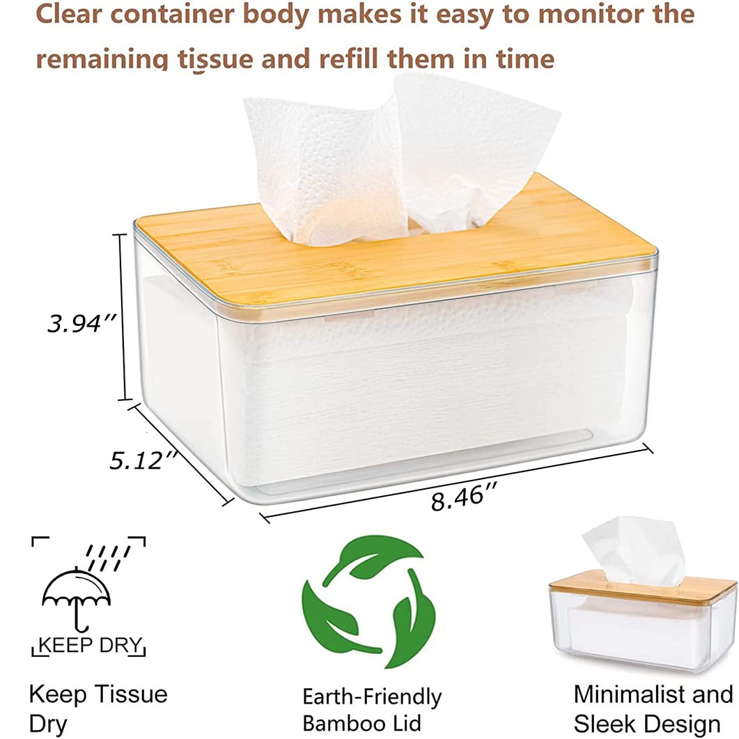 • 【Acrylic Tissue Box Holder】The tissue dispenser is comprised of a bamboo cover lid and a transparent container made of premium quality PET material. it won’t easily crack or splinter to provide long-lasting durability and reliable use.