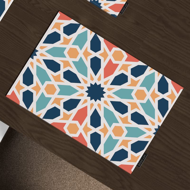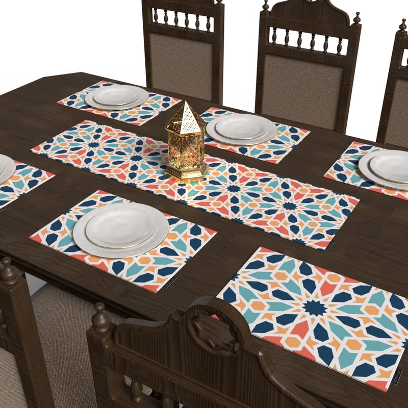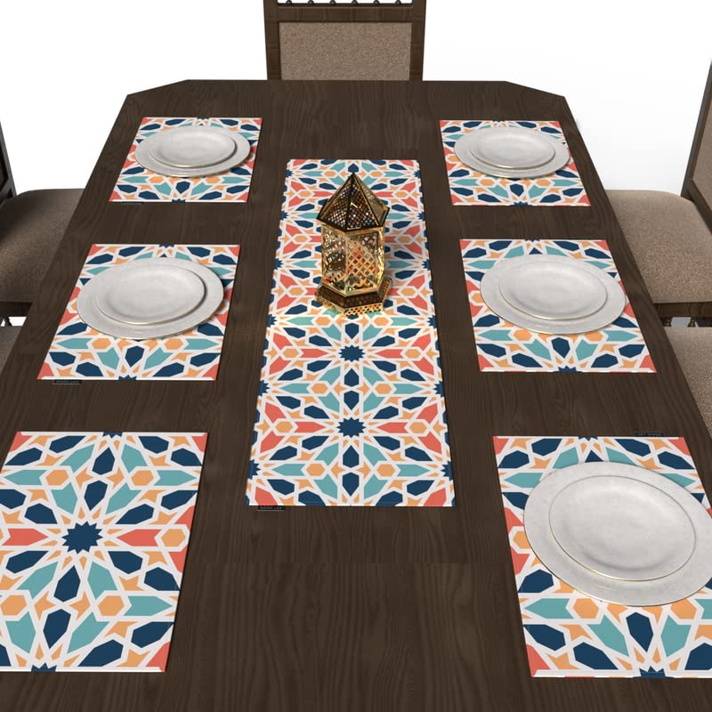 طقم طعام أرابيسك مكون من 7 قطع، مع 6 مفارش طعام من القماش متعدد الألوان (45 × 30 سم) وغطاء طاولة واحد (35 × 140 سم)، بنمط إسلامي خالد لخلق منظر طاولة أنيق واحتفالي.