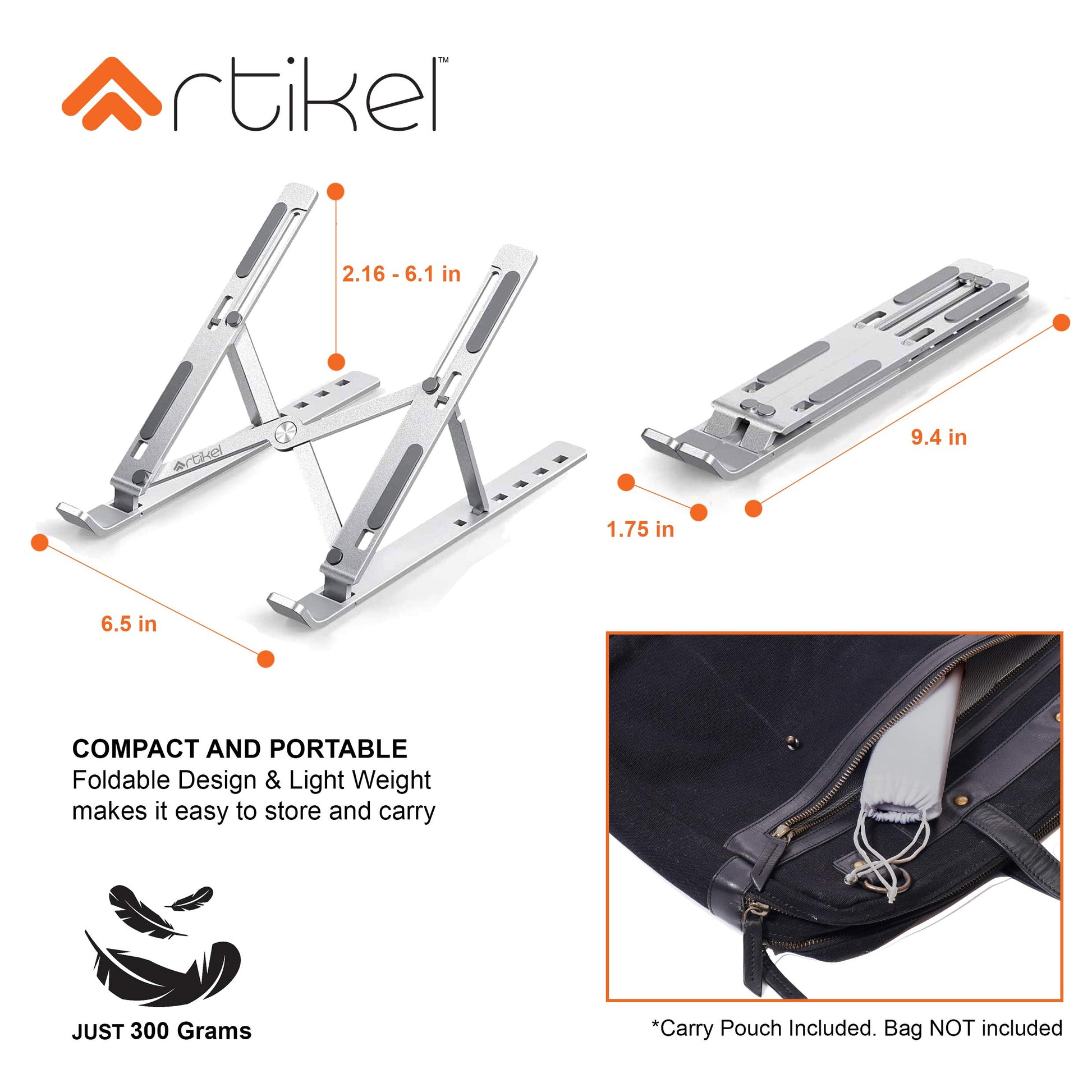 Artikel® Uni-Lite+ Laptop Stand with Carry Pouch | 6 Height Adjustable Riser for desk | Increased Laptop Ventilation | Ergonomic Foldable & Portable | Universally Compatible | Silver