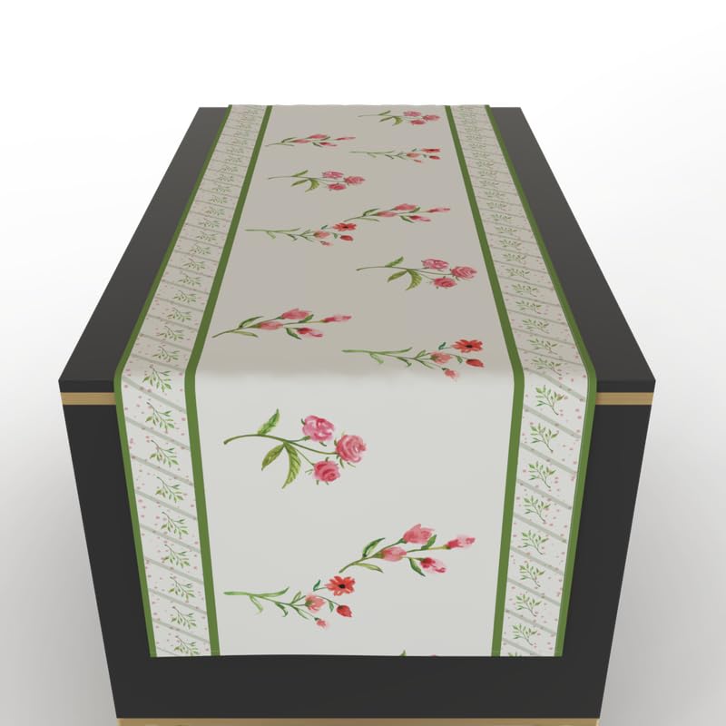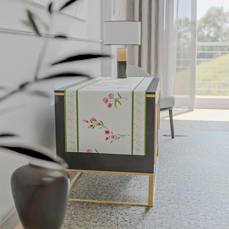 مفرش طاولة أزرق فاتح يشبه القطن، قطعة مركزية مزخرفة باللون الأبيض والوردي والأخضر، 35×140 سم، بتصميم زهور ساحر لإضفاء لمسة منعشة ولطيفة على ديكور طاولة الطعام.