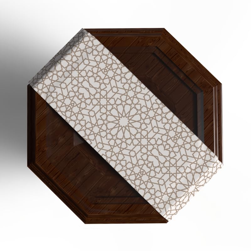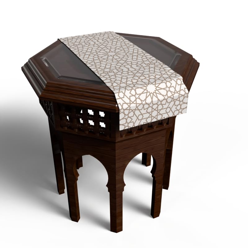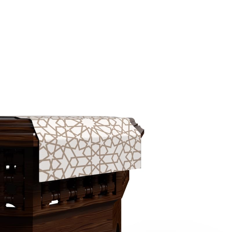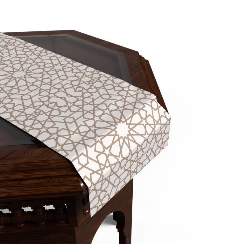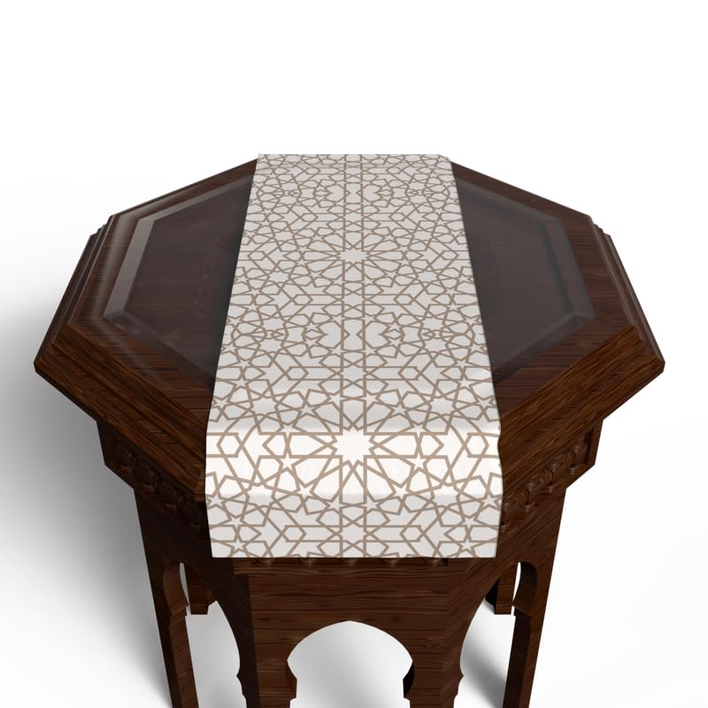 مفرش طاولة نوفا مخملي باللونين الأبيض والبيج، قطعة مركزية مزخرفة بمقاس 35×140 سم بنمط إسلامي مستوحى من السماء، مثالي لديكور طعام هادئ وروحاني في رمضان أو العيد.