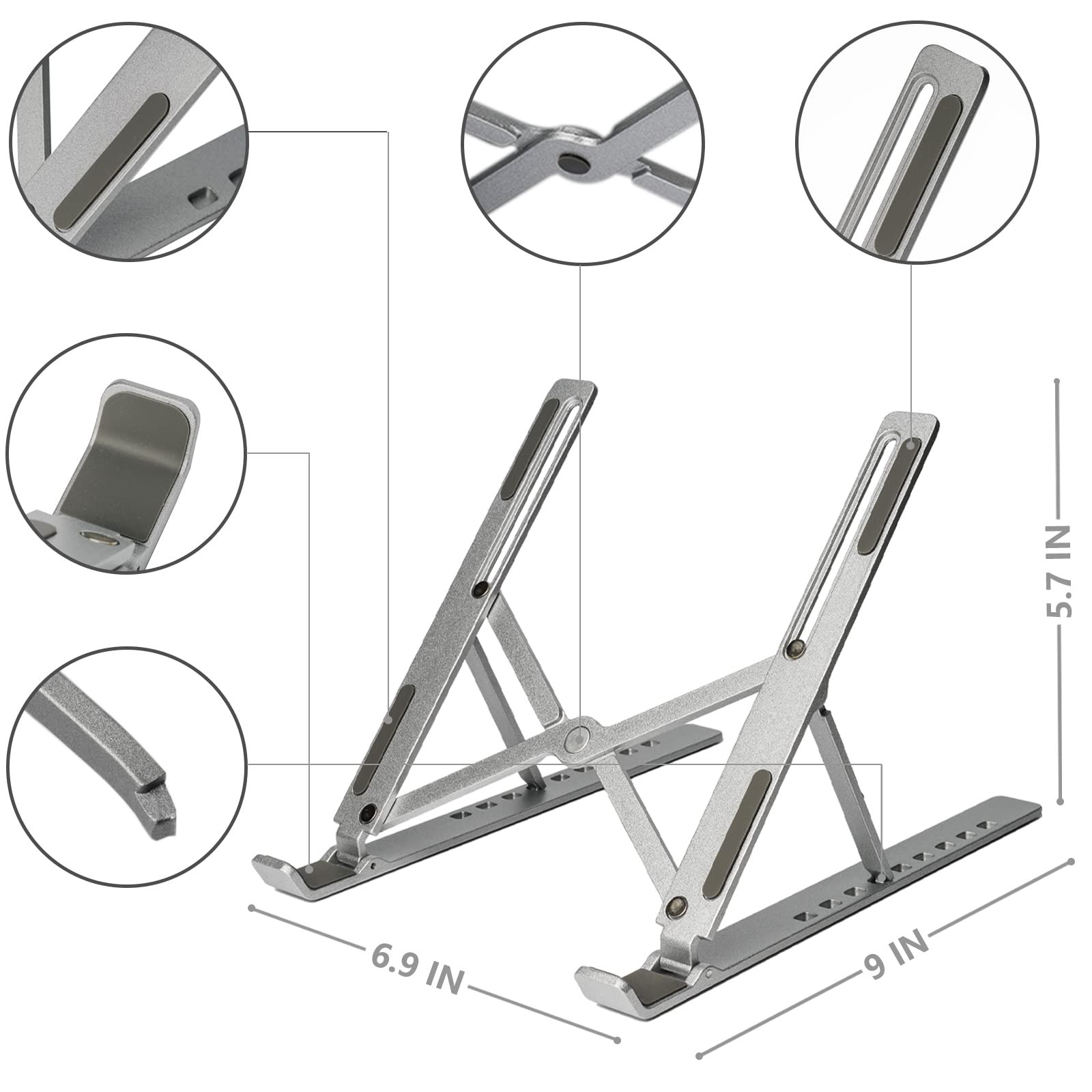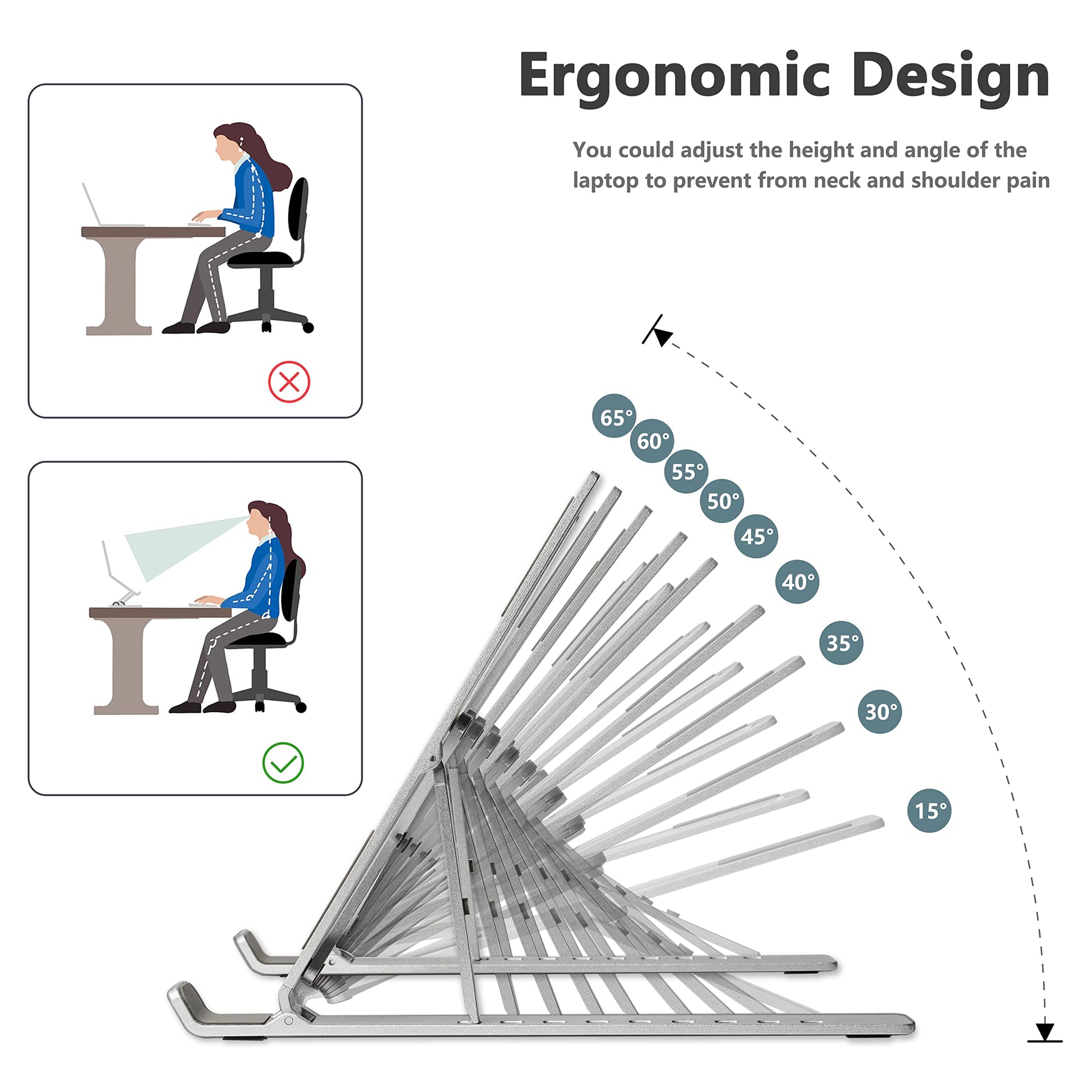 • Elegant and Durable: the laptop stand for desk is made of aluminum alloy and polished under exquisite workmanship, which makes the computer stand for laptop more elegant and durable than the plastic laptop stand. The aluminum is much better to absorb and dissipate the heat from the laptop, so the adjustable laptop stand will protect your laptop from overheating and keep it operate in high performance.