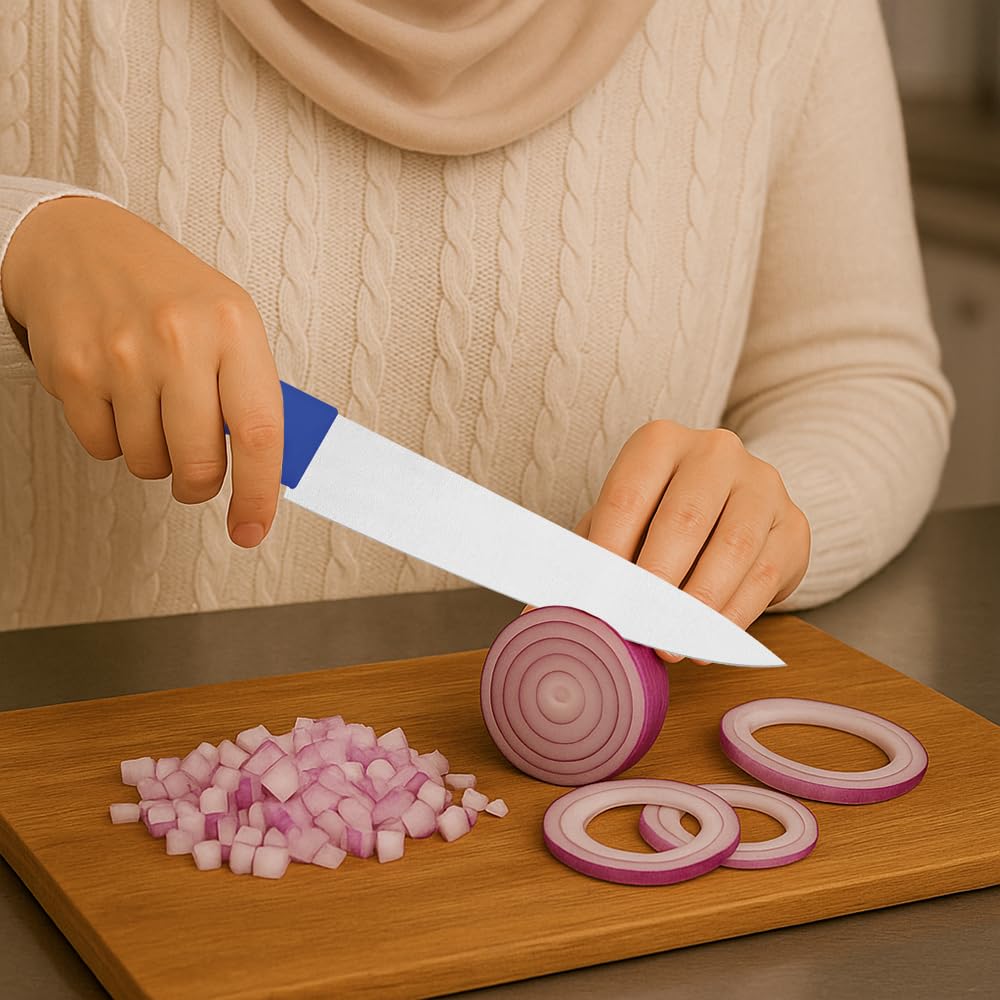 • تحتفظ الشفرة الحادة المصنوعة من الفولاذ المقاوم للصدأ بحافتها لفترة أطول، مما يجعلها مثالية للتقطيع والتقطيع إلى مكعبات والتقطيع ومجموعة متنوعة من مهام المطبخ اليومية.