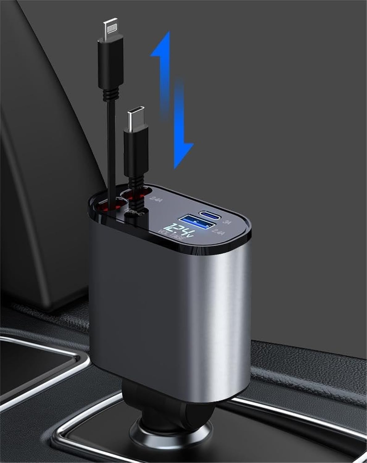 Retractable Car Charger Station, 4-in-1 Multi-Port Adapter with Dual USB-C and USB-A Outputs, Compact Cable Organizer for 12V/24V Vehicles, Phone Charging Hub, Black
