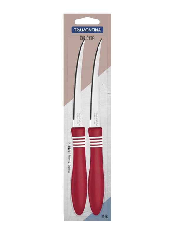 مجموعة سكاكين شرائح اللحم من قطعتين - شفرات مسننة من الفولاذ المقاوم للصدأ بطول 22 سم، ومقابض متينة من البولي بروبيلين باللون الأحمر، وتقطيع دقيق للحوم، وقبضة مريحة، وآمنة للاستخدام في غسالة الأطباق