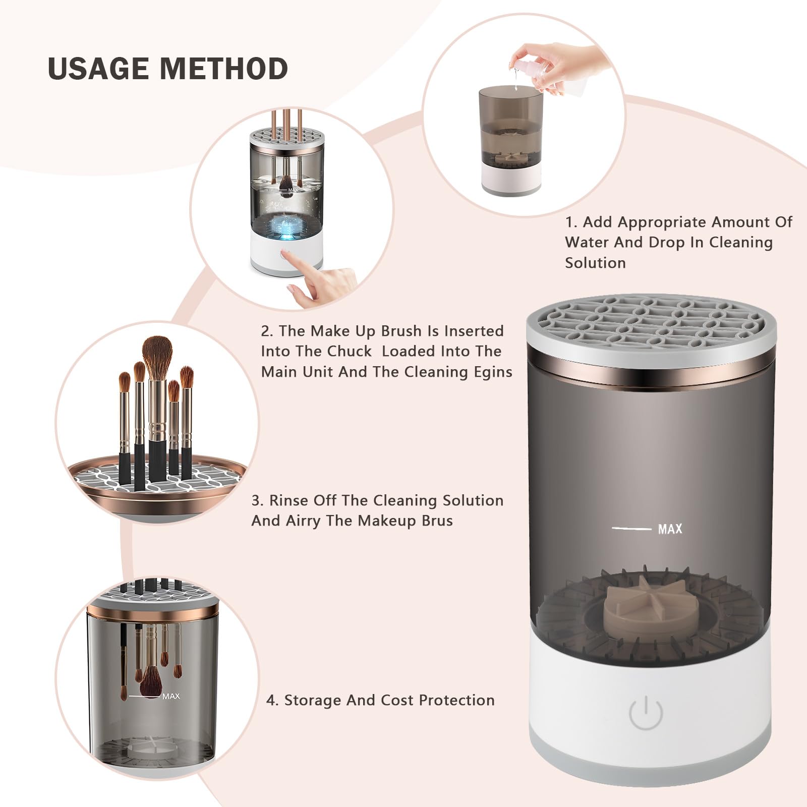 • 【Easy to Use & Portable Design】To use, pour water and cleaning solution into the container of the brush cleaner makeup, approximately half of the container's capacity. Then, insert the USB cable and place the makeup brush into the silicone cap. Press the switch to start the cleaning process. After that, you can invert the makeup brush onto the silicone cap for drying. Its compact dimensions of 9*9*16cm and lightweight design of 260g make it extremely portable and easy to carry.