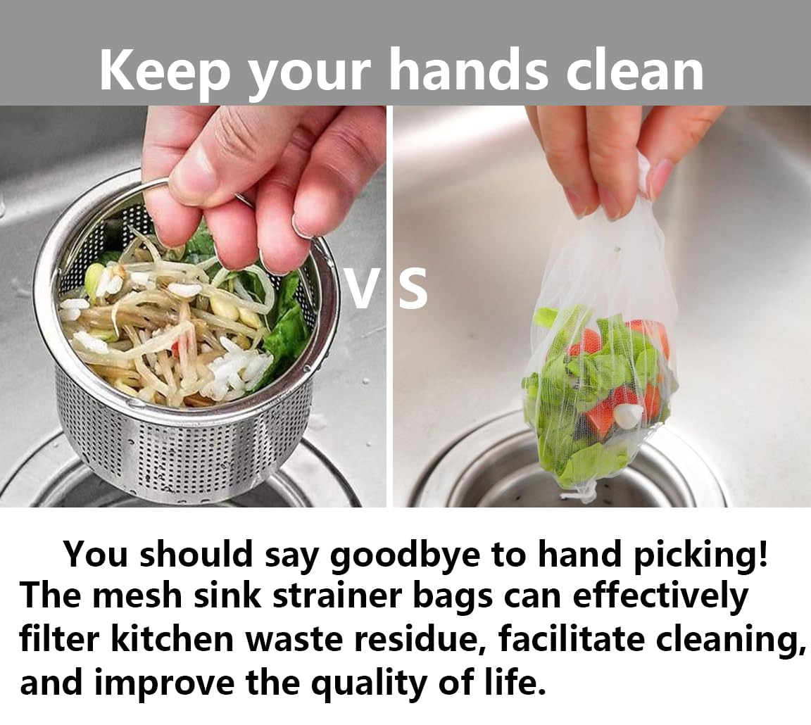 • Size and Quantity: 200 disposable mesh sink strainer bags. The size of the kitchen sink strainer trash bag is 4.3 x 3.5 inches, which can be stretched to 10.2 x 8.3 inches, making it very conducive to cleaning.