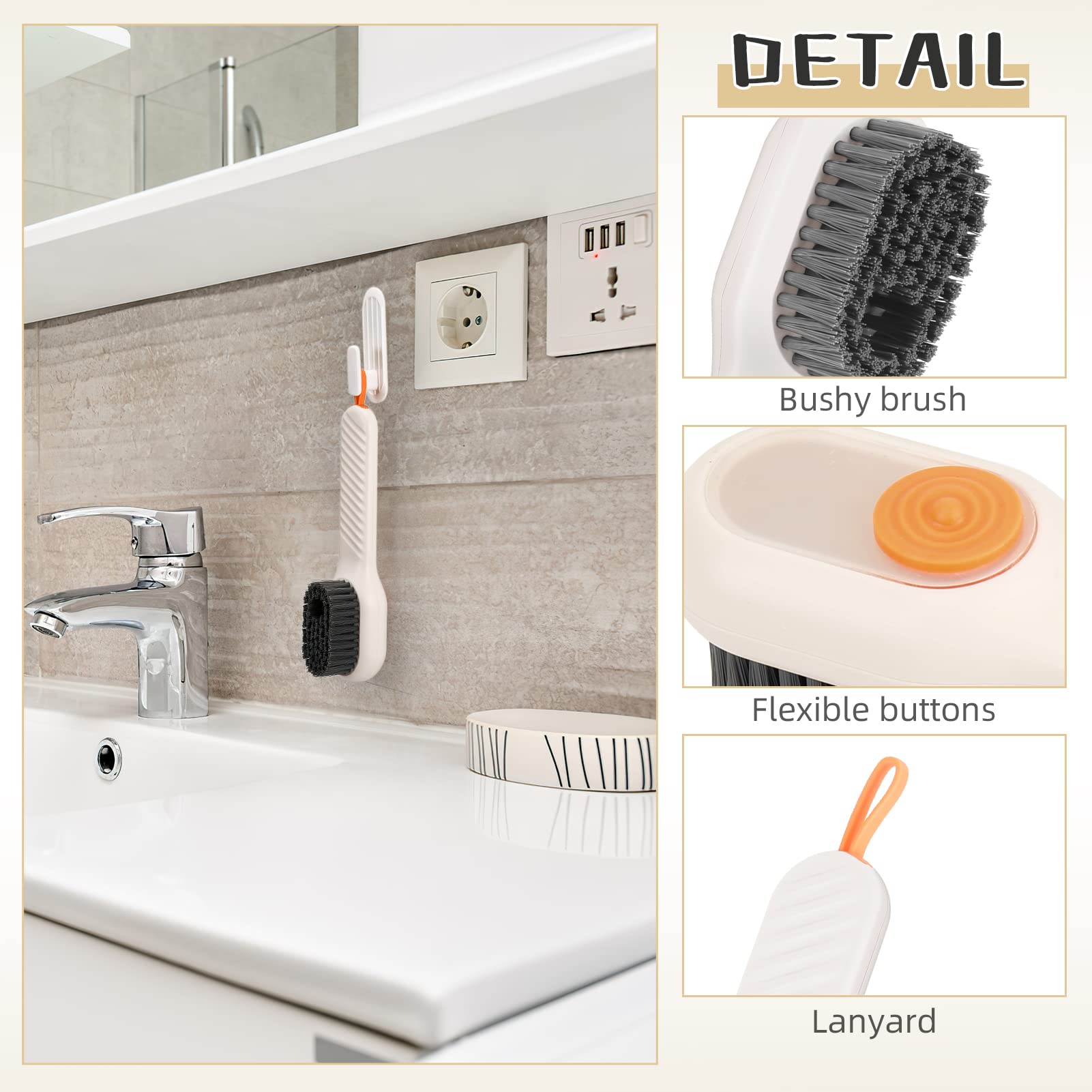 • Practical: This shoe brush with detergent dispenser has durable nylon bristles, extra strong fibres and dense bristles. It quickly and effectively removes dirt from the textile fibres, deep cleaning for corners, scuffs and details and does not damage clothing or shoes.