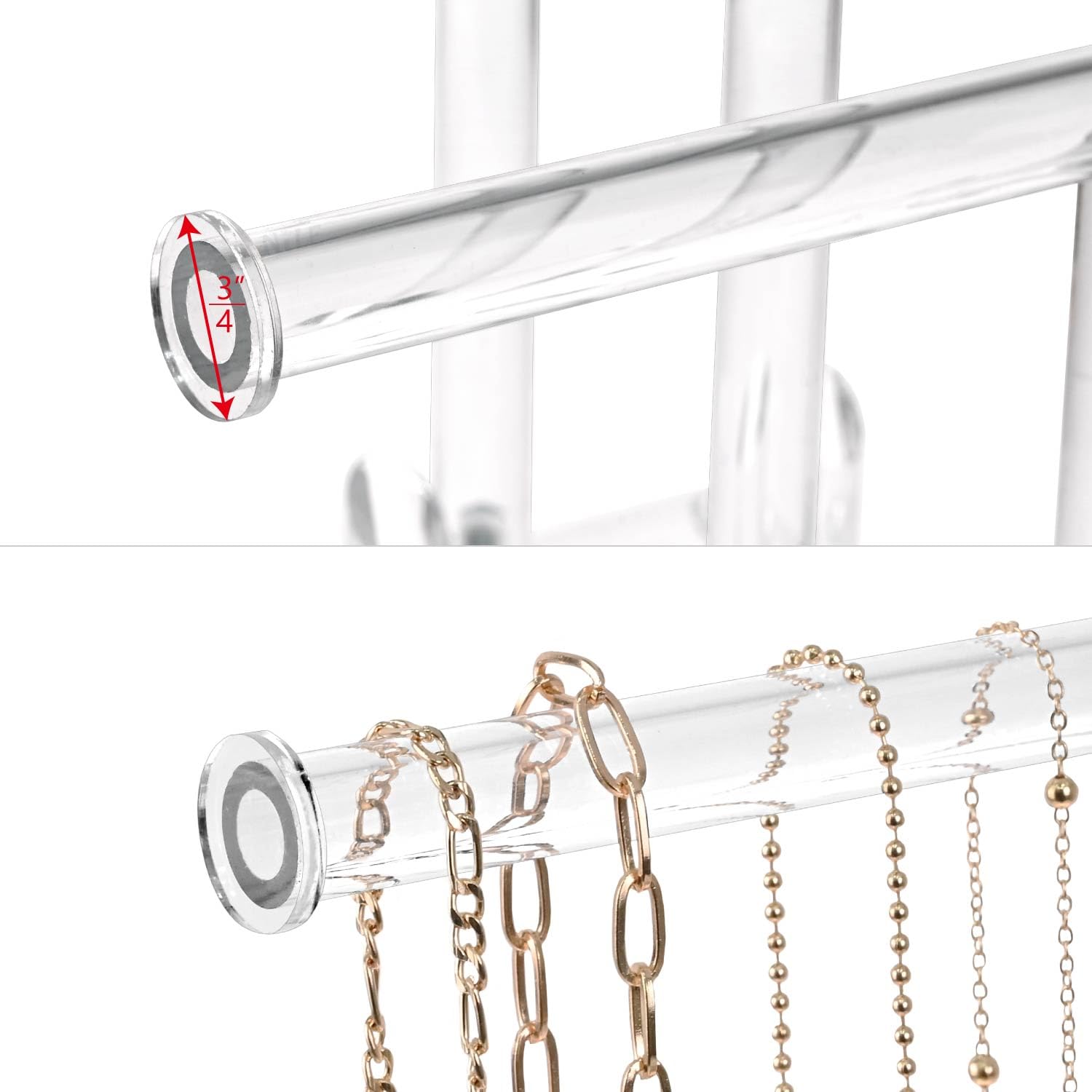 • 3-Tier Necklace Display with Ring Holders: Features three graduated T-bars for organizing necklaces of various lengths, plus four ring holders at the base — perfect for showcasing complete jewelry sets.
