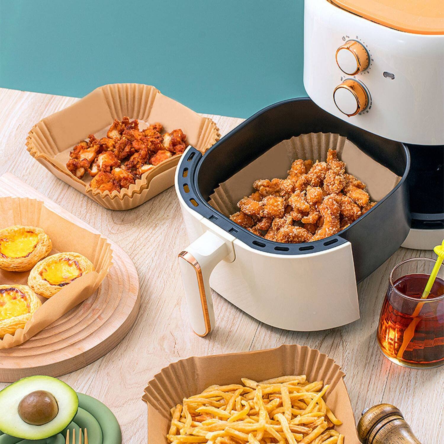 100 PCS Air Fryer Disposable Paper Liners, Non-Stick, Oil-Proof, Heat-Resistant, Food Grade Parchment for Frying, Baking, Easy Cleanup, Compatible with 5-8 Qt Air Fryers, Square Design, 20 cm