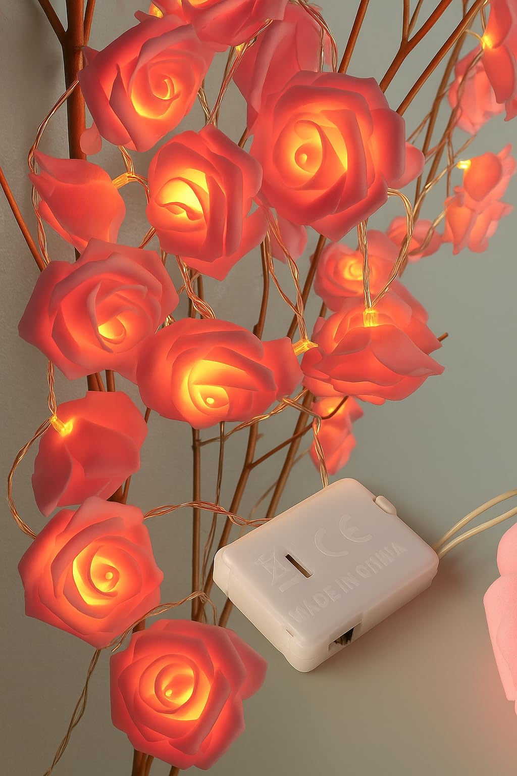 فرع ورد بينك مضيء (عدد20 لمبه LED) ببطارية – طول 3 متر – إضاءة ورم دافئة – ورد بينك – مناسب للديكور والحفلات وغرف النوم