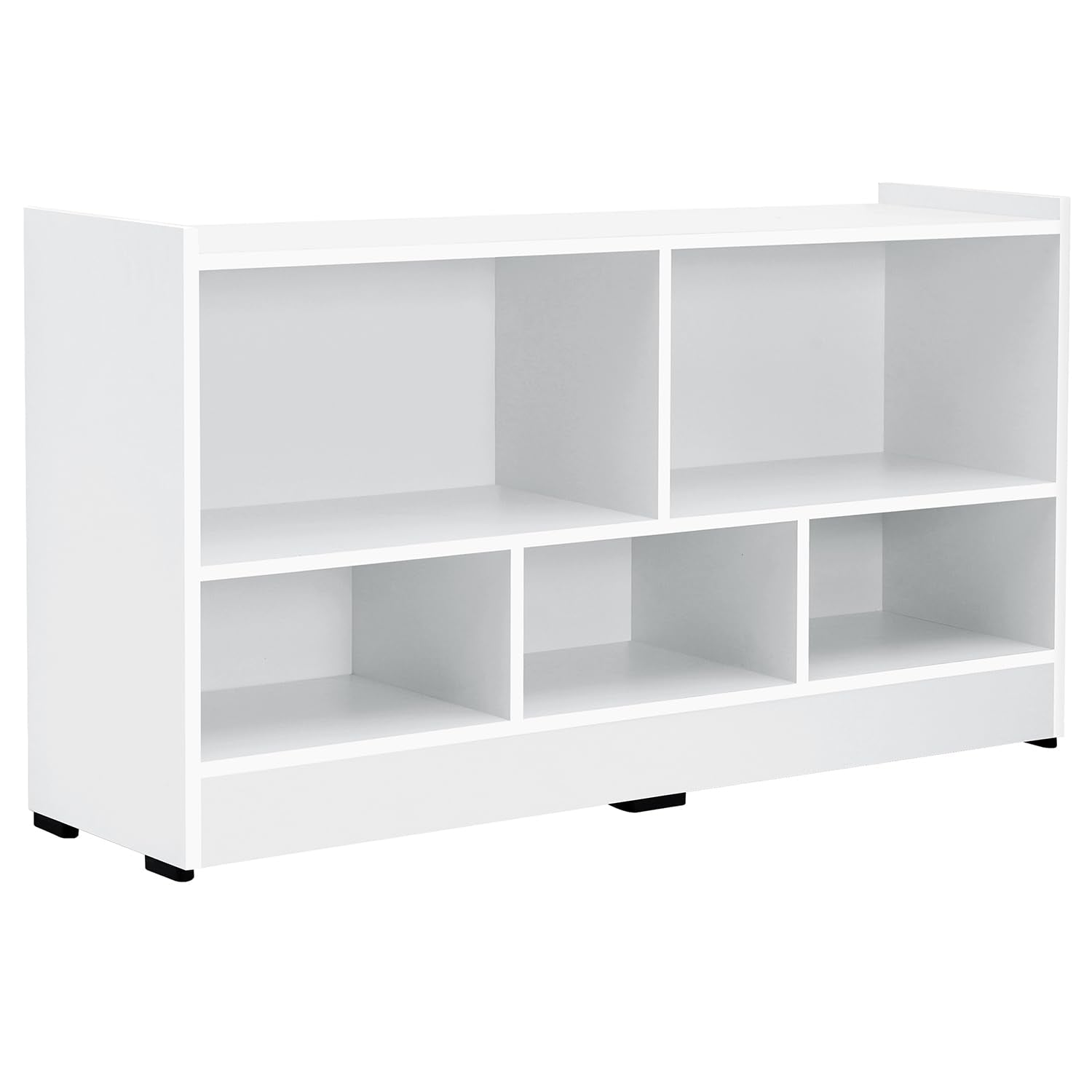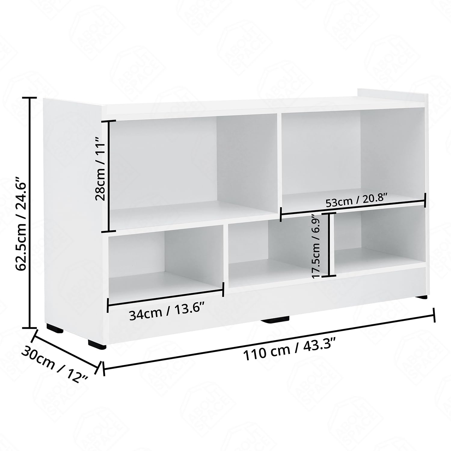 Organize your space with this slim and modern 5-compartment book shelf from Modern Home. Crafted from durable engineered wood with a clean White finish, this versatile stand is designed for the modern home or office. Its low-profile, elongated design (L110 x H62.5 cm) makes it perfect for use under windows or as a room divider. The five open compartments provide ample space for books, files, and decor, offering a stylish and practical open storage solution for any room.