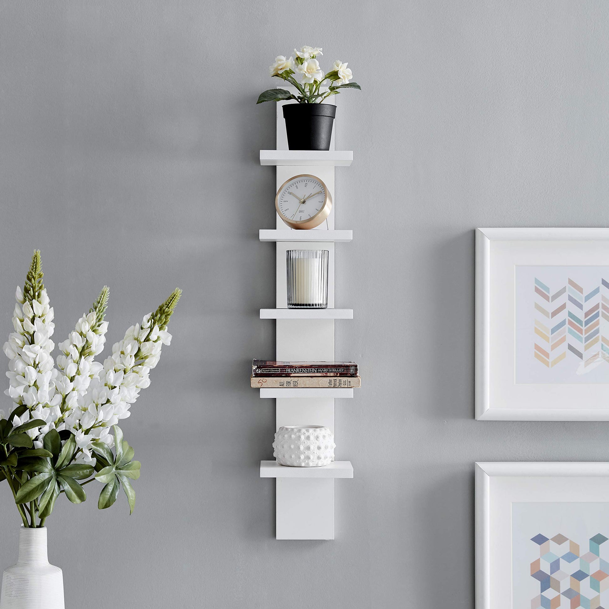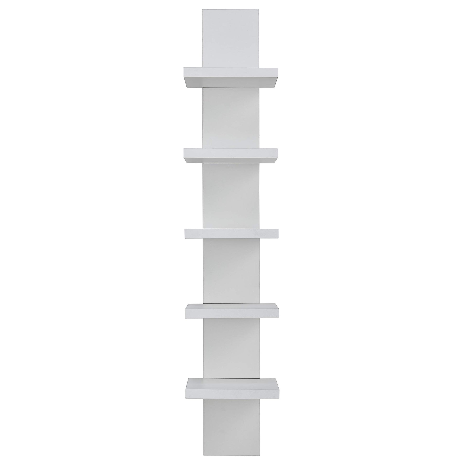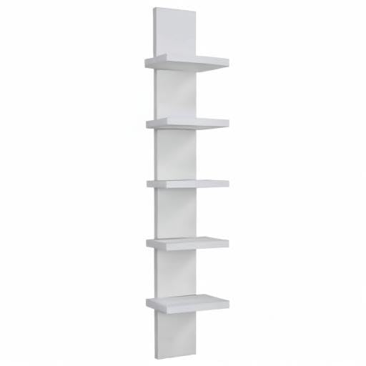 5-Tier Narrow Vertical Wall Unit, Tall Column Floating Storage Organizer and Utility Shelf for Bedroom or Living Room, Space-Saving Design in a White Laminate Finish