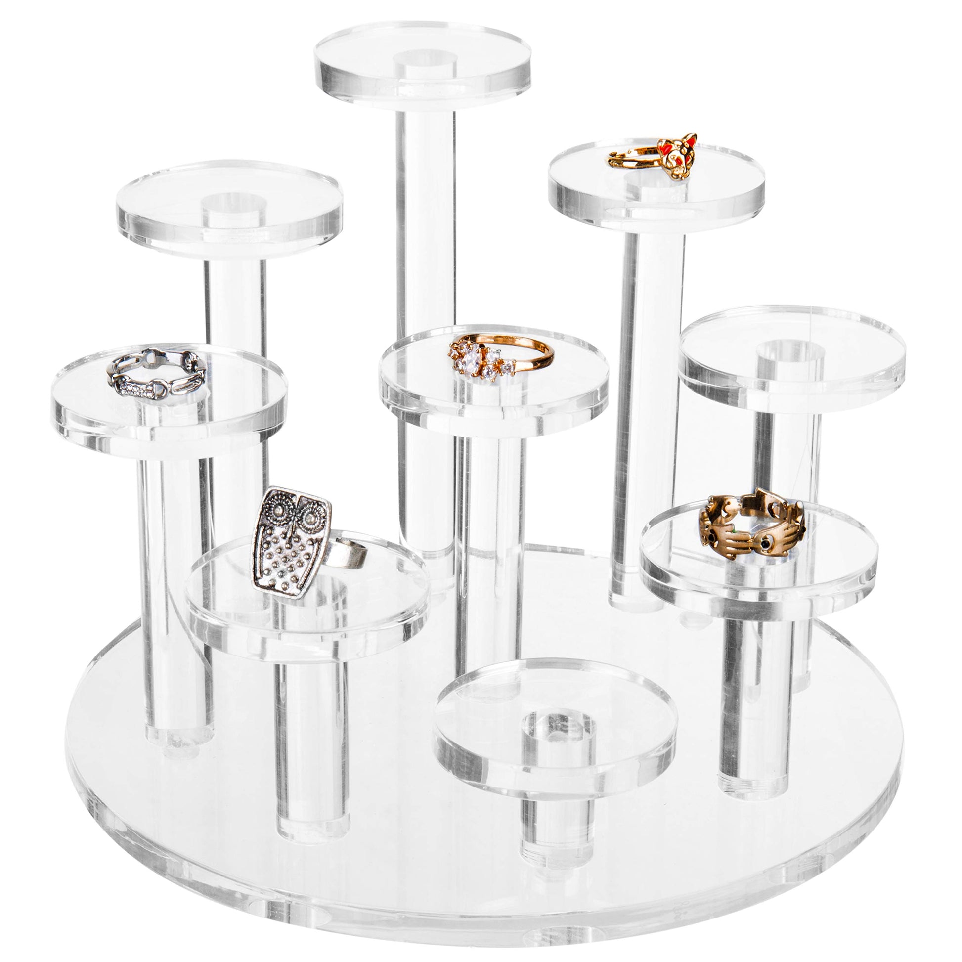• 9-Tier Acrylic Ring Organizer Stand: Features nine graduated tiers designed to elegantly display rings, earrings, and small jewelry. Ideal for dresser tops, retail counters, boutiques, exhibitions, and trade shows to showcase jewelry collections.