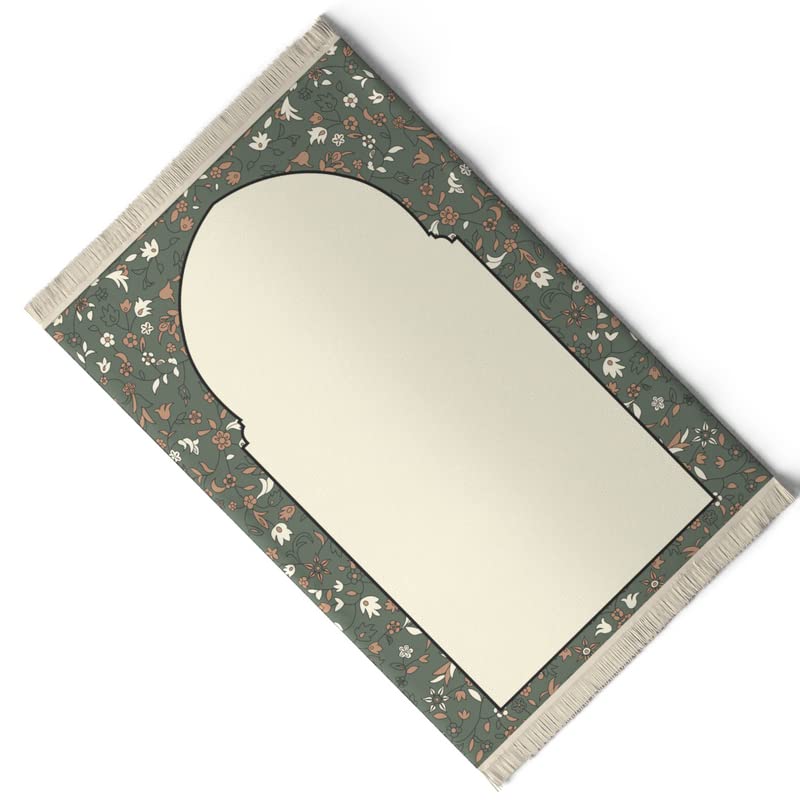 Al Rawda Velvet Prayer Mat, a Luxurious Islamic Rug in Beige and Olive with an Elegant Mosque Garden Design, 68x117 cm, made from Soft Velvet for a Comfortable and Peaceful Prayer Experience