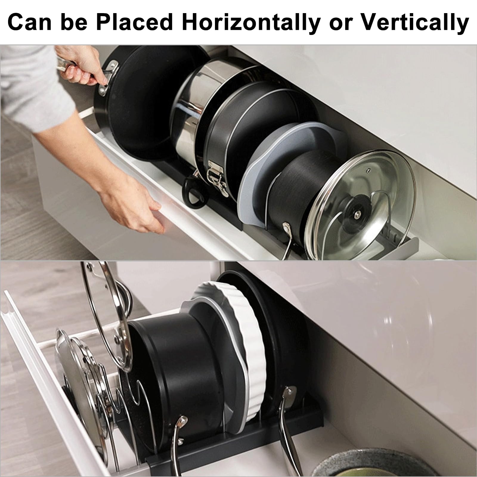 • 🍽️【Save Space】: ALLWYOU retractable cabinet pot rack is suitable for storing most types of pots and pans. It can be used to store various pot lids, pans, frying pans, baking sheets, tableware, saucepan lid storage, baking tray storage rack etc., and neatly store various kitchen utensils on the kitchen countertop, cupboards, shelves.