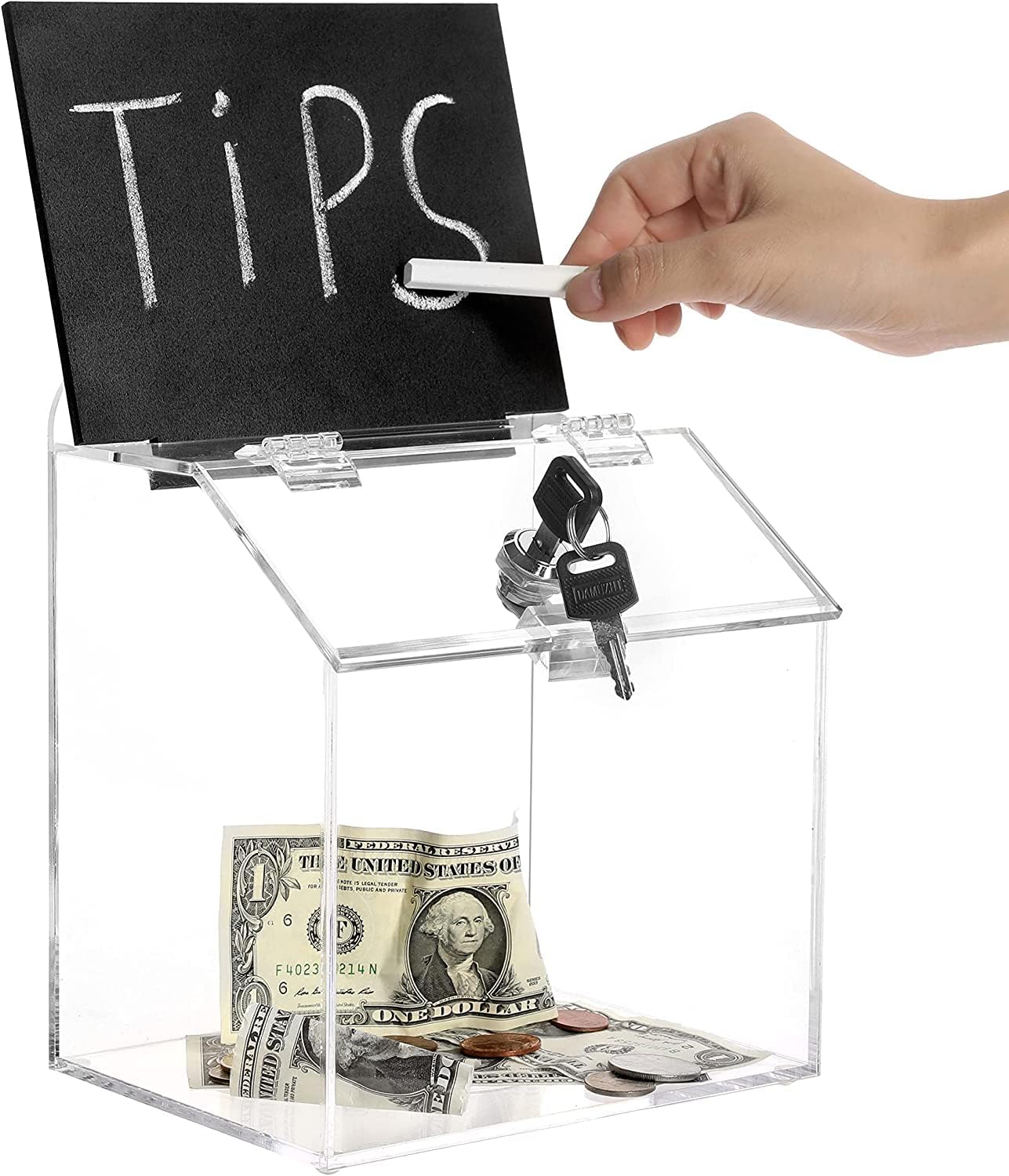 Clear Acrylic Donation Box with Lock and Key, 18 x 14 x 22 cm, Wall Mounted or Countertop Collection with Chalkboard Sign and Removable Display, Secure Fundraising Tip