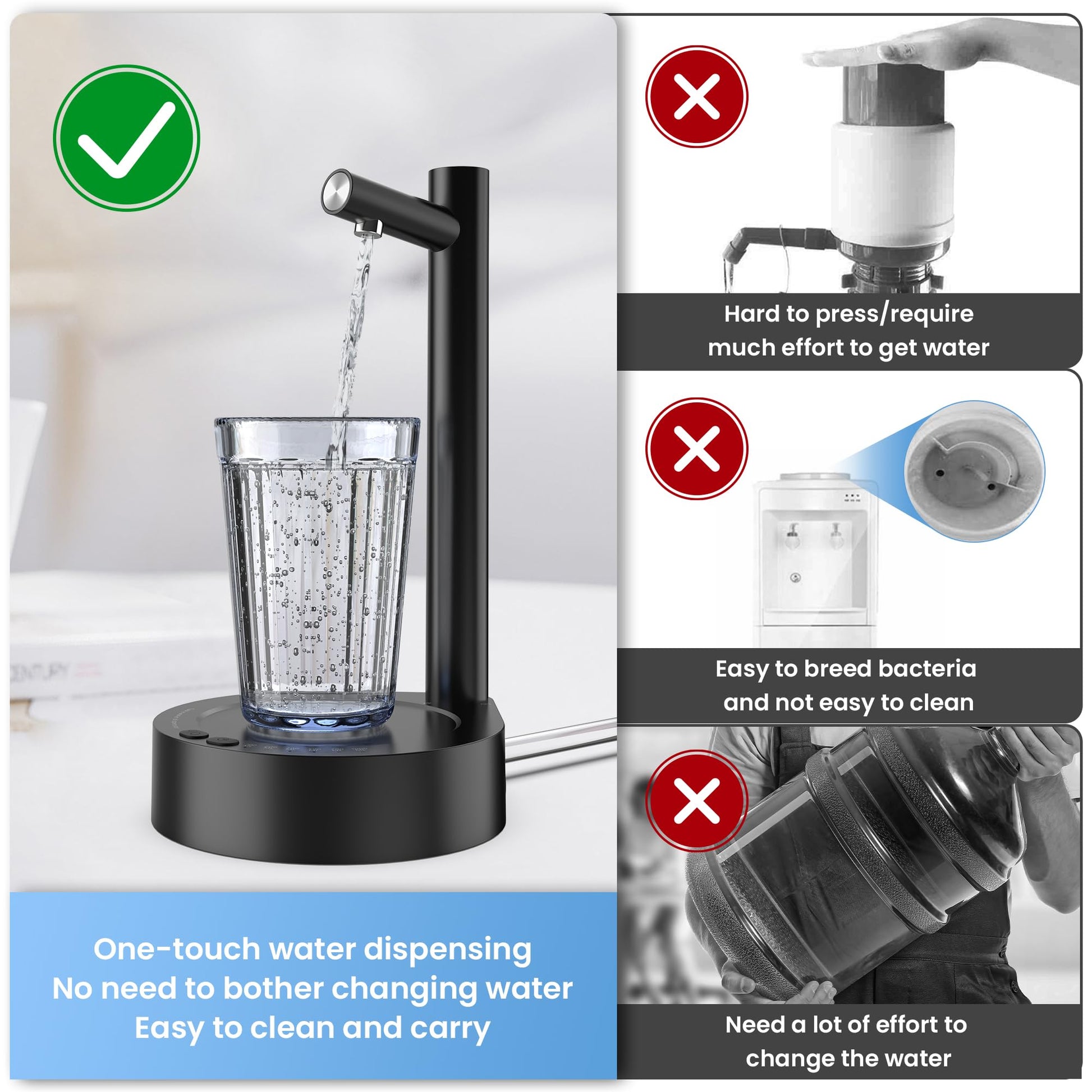 • More compatible: Desktop water dispenser, not only with the commonly used 1-5 gallon water bottles compatible but also with other standard size water bottles, countertop design, so you do not have to bend down to get water!