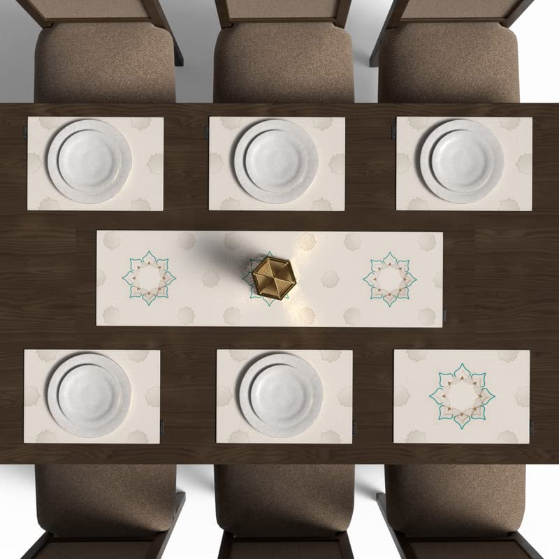 Dora 7-Piece Dining Set, includes 6 multicolor canvas placemats (45x30 cm) and 1 table runner (35x140 cm), featuring a vibrant, jewel-like Islamic pattern for a colorful table
