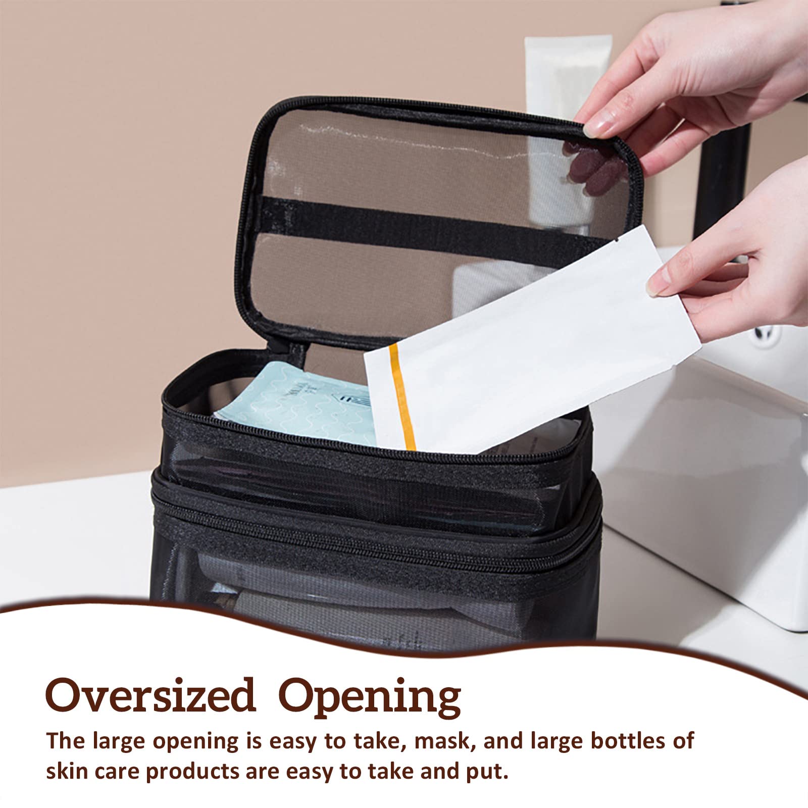 Double Layer Makeup Bag, Large Mesh Travel Cosmetic Pouch with Double Zipper, Vertical Multifunctional Toiletry Bag for Makeup Brushes