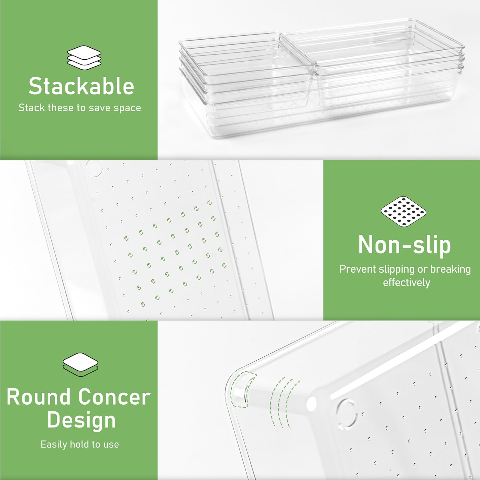 • VERSATILE ACRYLIC DRAWER ORGANIZER: These drawer divider trays are not limited to one specific purpose. These plastic drawer storage can be use as utensil organizer for kitchen drawers, silverware organizer, makeup storage, bathroom organization, or junk drawer organizer kitchen. These containers for organizing can be used wherever you need to streamline your organizers and storage.