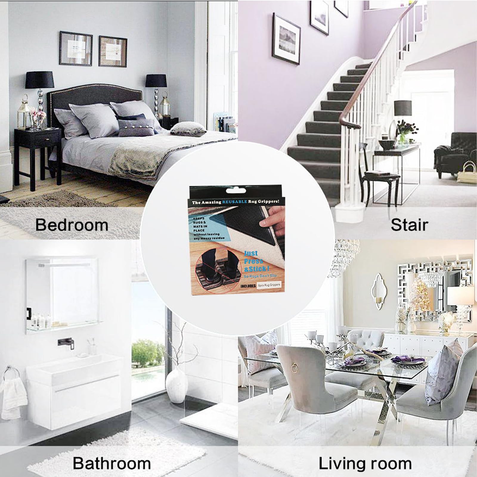 • QUICK & EASY INSTALLATION -This rug gripper for carpeted floor can be firmly adhered to the floor as long as the adhesive is peeled off, the carpet sticker is attached to the four corners of the carpet, and then the film on the silicone surface is removed and stick it to your floor and you're done.