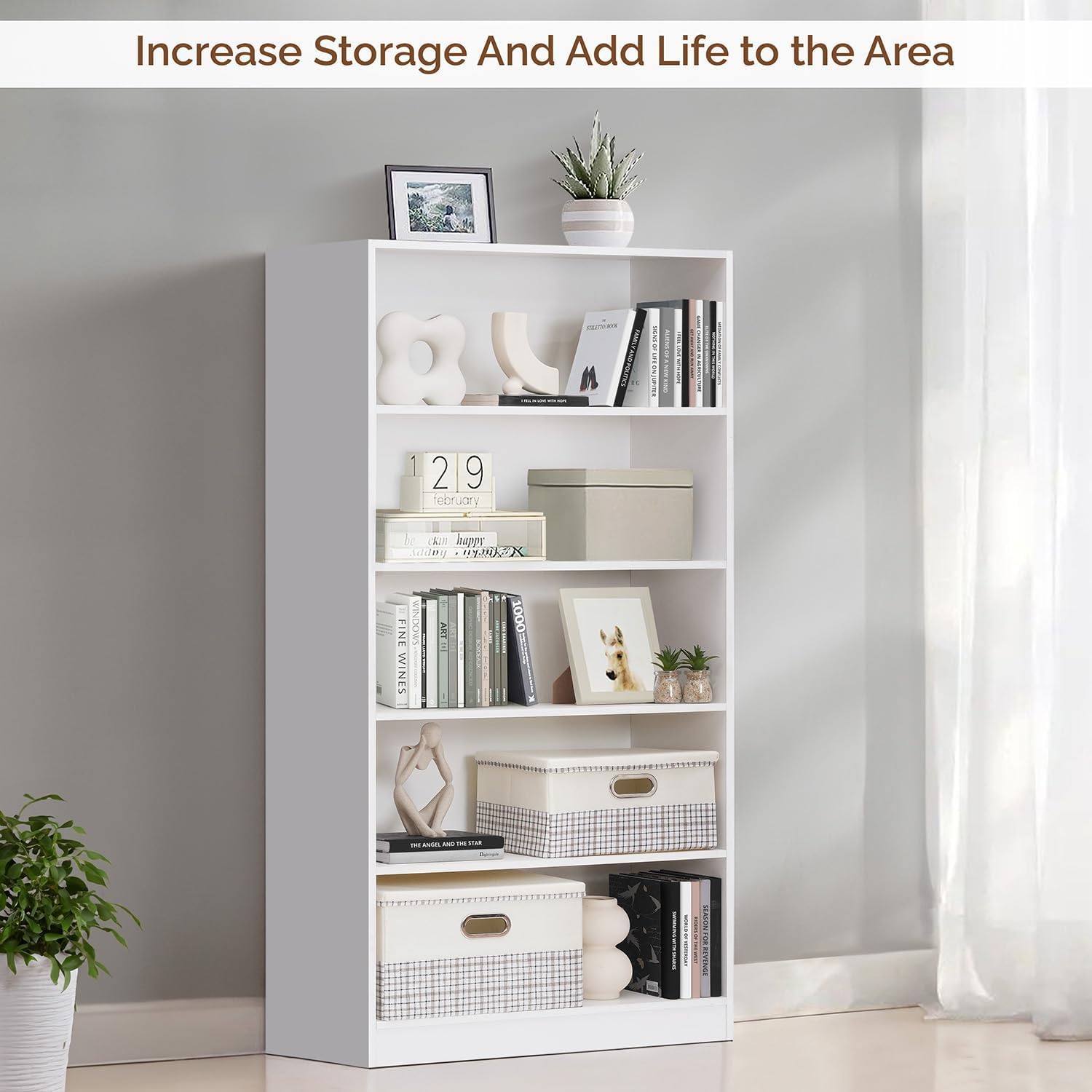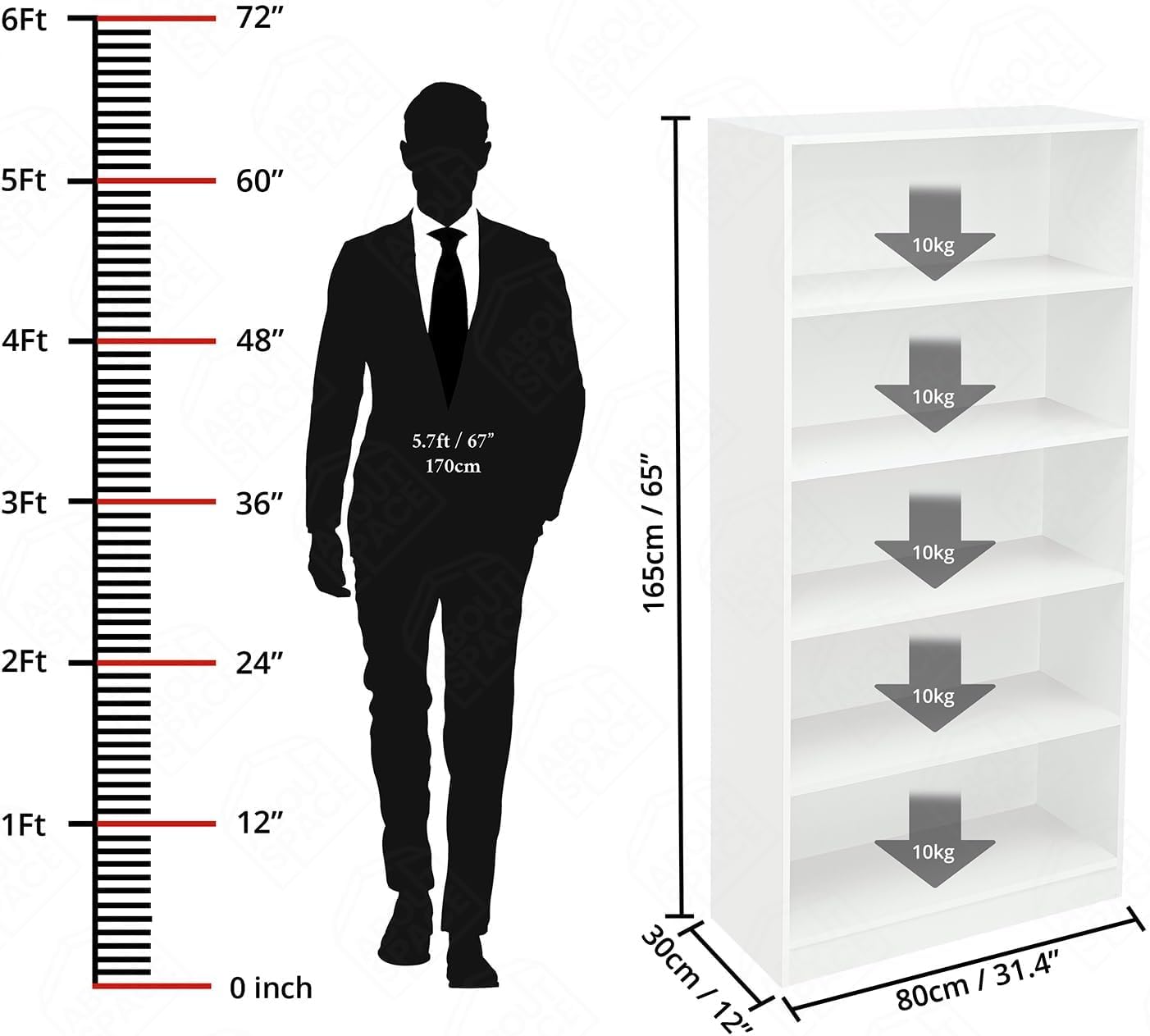 Ergonomic 5-Tier Geometric Wood Bookshelf in White, 1.6m Tall Multipurpose Home Library Organizer, Open Storage for Bedroom, Living Room, Study (L80cm x D30cm x H160cm)