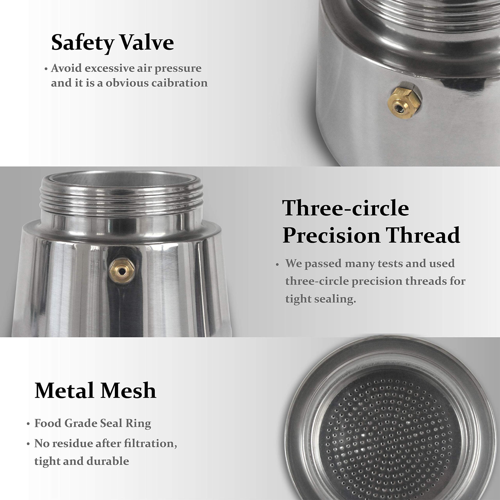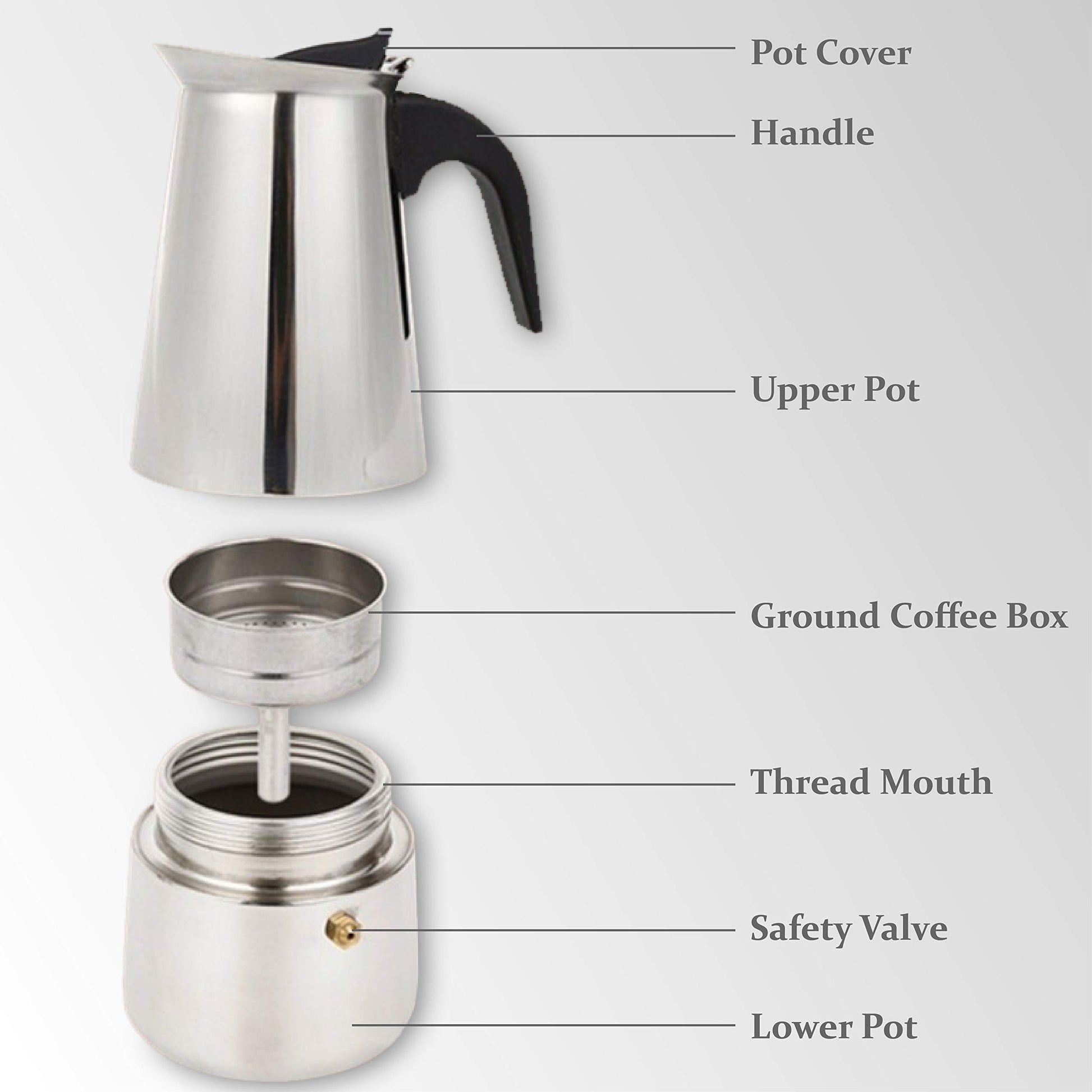 Espresso Maker Moka Pot 4 Cup (200ml) for Gas or Electric Stovetops, 304 Stainless Steel Espresso Maker, Suitable for Espresso, Cappuccino, Latte, Silver