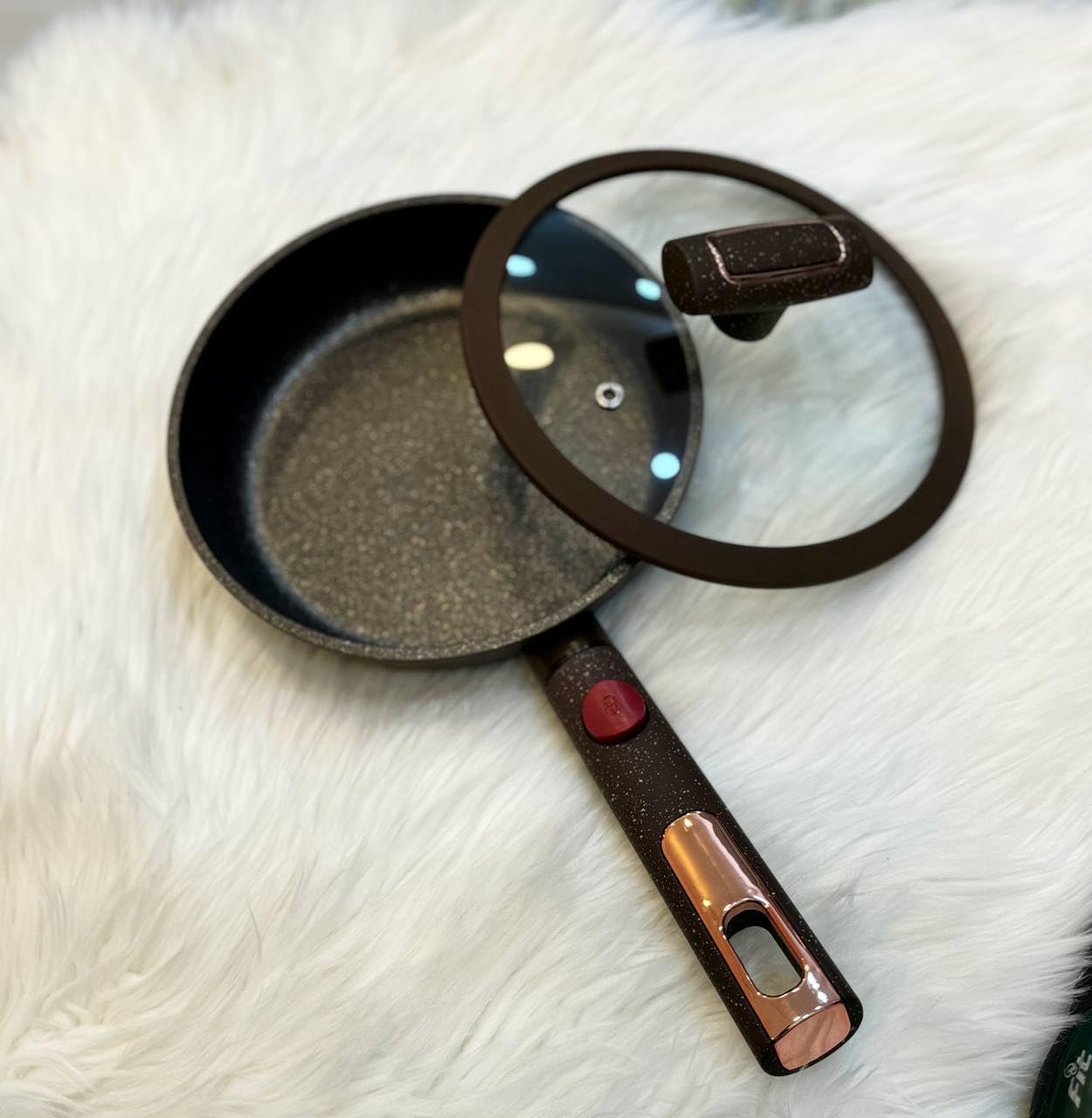 Granite Frying Pan with Glass Lid, Silicone Edges, Movable Handle, Non-Stick Coating, Durable Design, Ideal for Healthy Cooking, Heat Resistant, Easy Cleaning