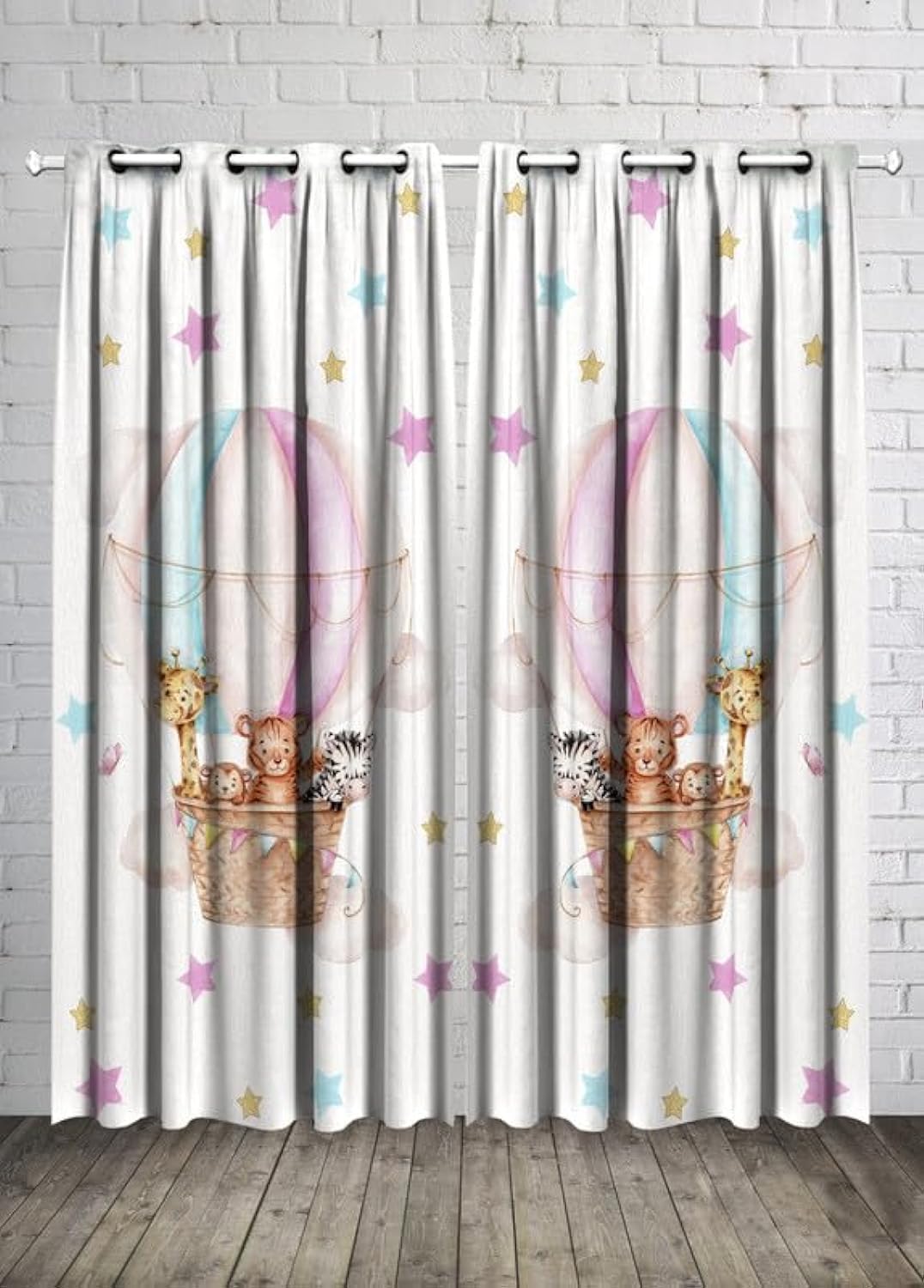 Kids Room Balloons and Safari Animals Baby Girl Curtain -Linen Velvet Fabric -Privacy - Steel Grommets - 2 Pieces
