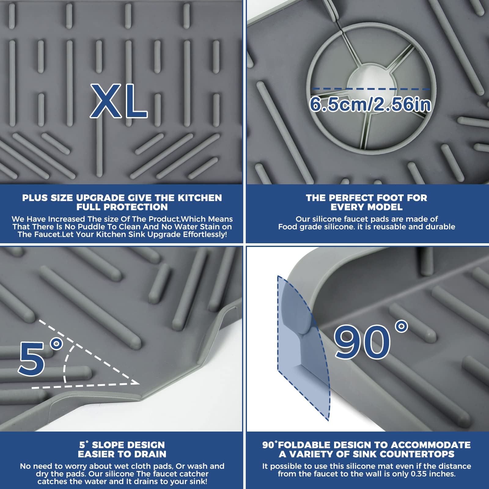 • 💪【5° UPGRADE VERSION】 Silicone sink faucet mat with upgraded 5° slope design and upgraded 0.79" (2 cm) thickness, the kitchen faucet splash guard allows captured water to flow into the sink faster, resulting in faster drying of the kitchen sink. This means never gets soggy, or not having any water spots by the sink faucet. You don't need to worry about the water staying on the sink & bathroom counter. Upgrading your kitchen sink & bathroom countertop in an effort-saving way!