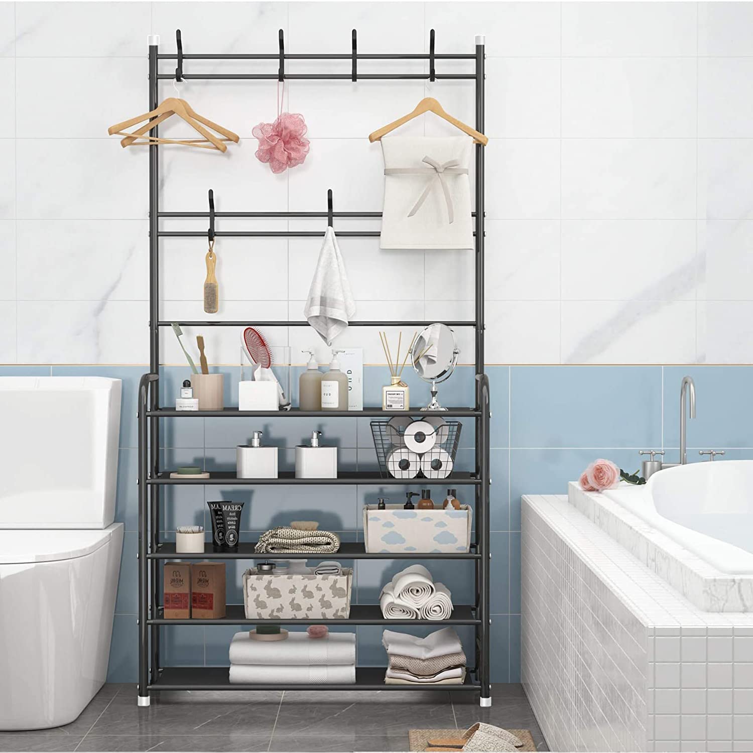 LEOPAX Bench Coat Rack with Shoe Storage, Multifunctional Cloth Stand with Shoe Shelf Organizer with 5-Tier and 8 Hooks for Bedroom, Hallway, Entryway - Size 58 x 23 x 170cm - Metallic Black