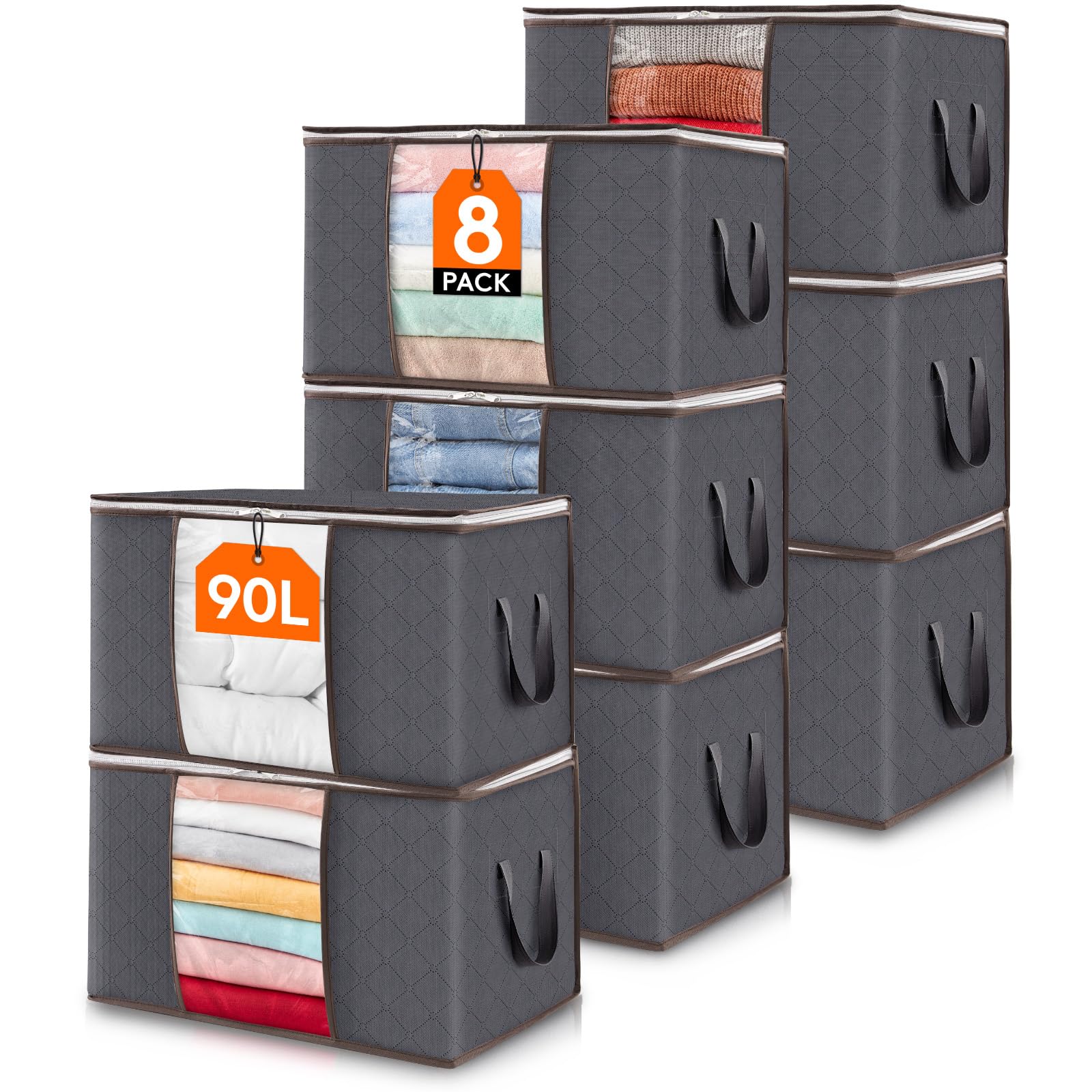 Lifewit Large Capacity Clothes Storage Bag Organizer with Reinforced Handle Thick Fabric for Comforters, Blankets, Bedding, Foldable with Sturdy Zipper, Clear Window, 8 Pack, 90L, Grey
