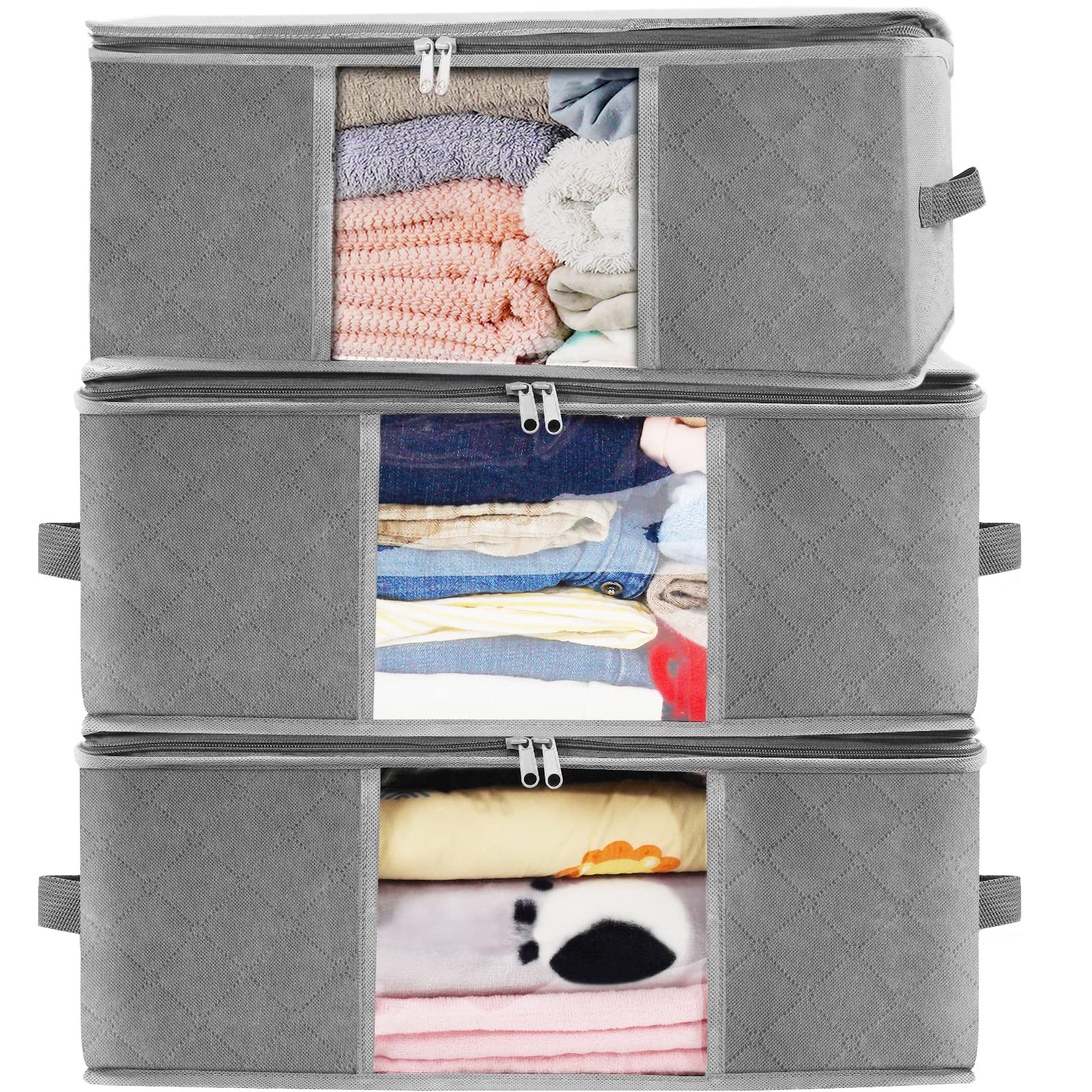 LSNDEE Clothes Storage Boxes Foldable, Fabric Storage Box, Under the Bed Storage Bags with Zips, Waterproof Thick Non-woven closet Organizers, Used For Duvet Clothing, 48 x 35 x 20 cm, 3 Pack (Grey)