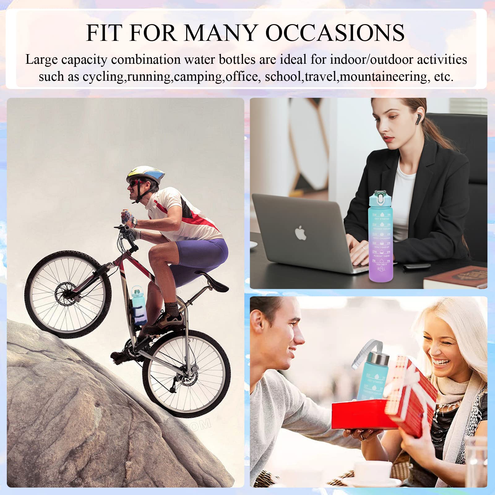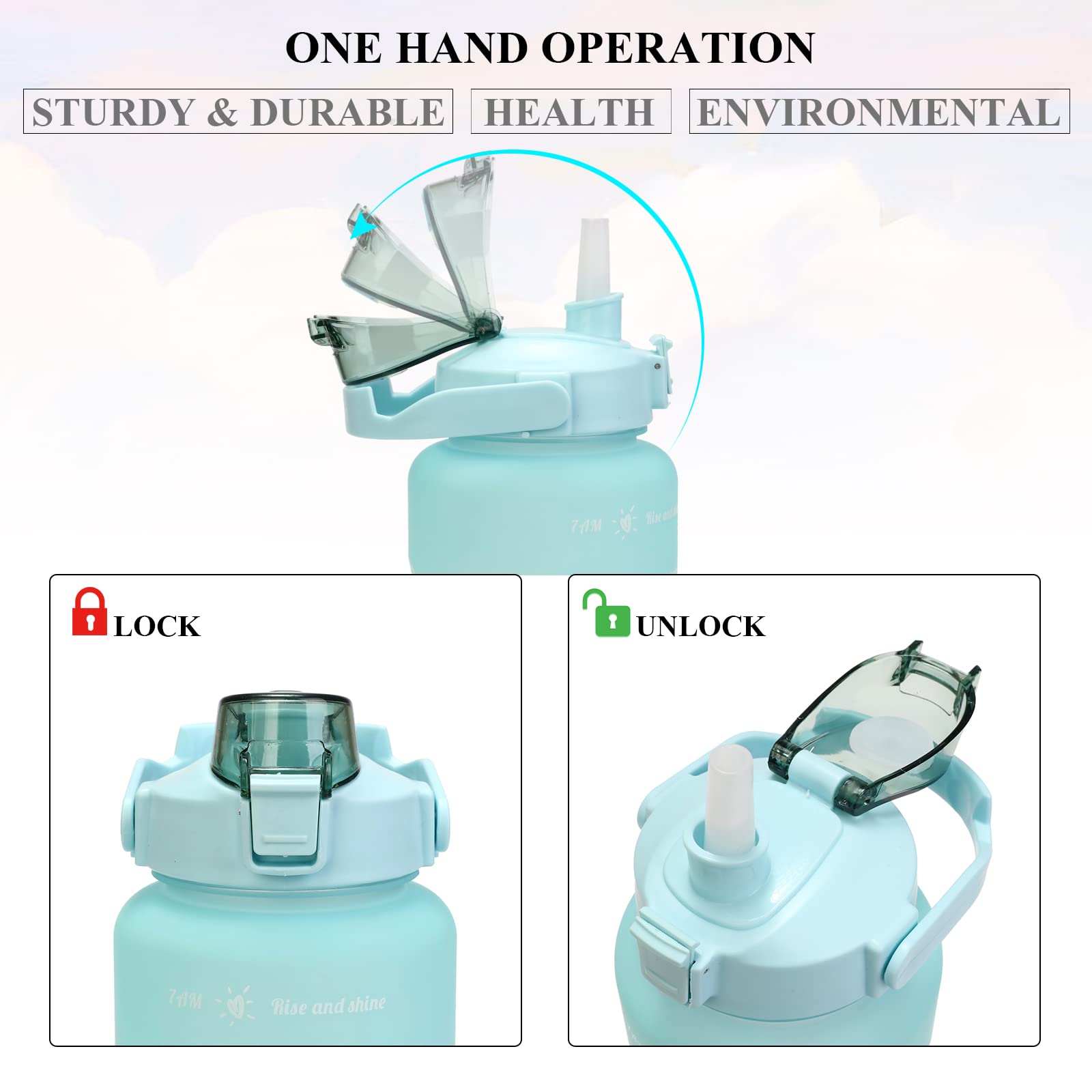Motivational Water Bottle with Straw 3 Pcs, 64oz 32oz 16oz Time Marker Large Drinking Bottles Leakproof Half Gallon 2L Water Jugs for Sports Gym Travel BPA Free - Gradient Green
