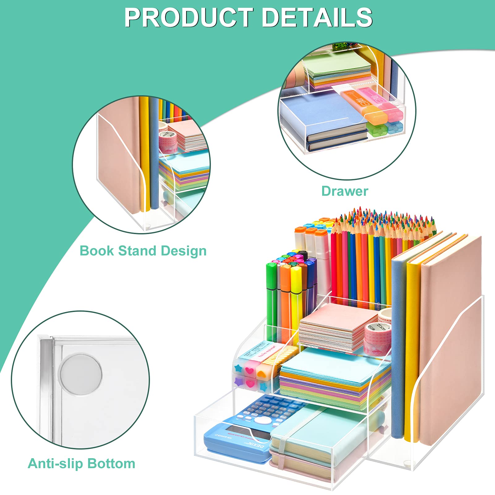 Multifunctional Clear Acrylic Desk Organizer Station with Drawer, 8-Compartment Desktop Pen and Paper Holder for Office Supplies, A4 Magazines, and Art Supply Storage