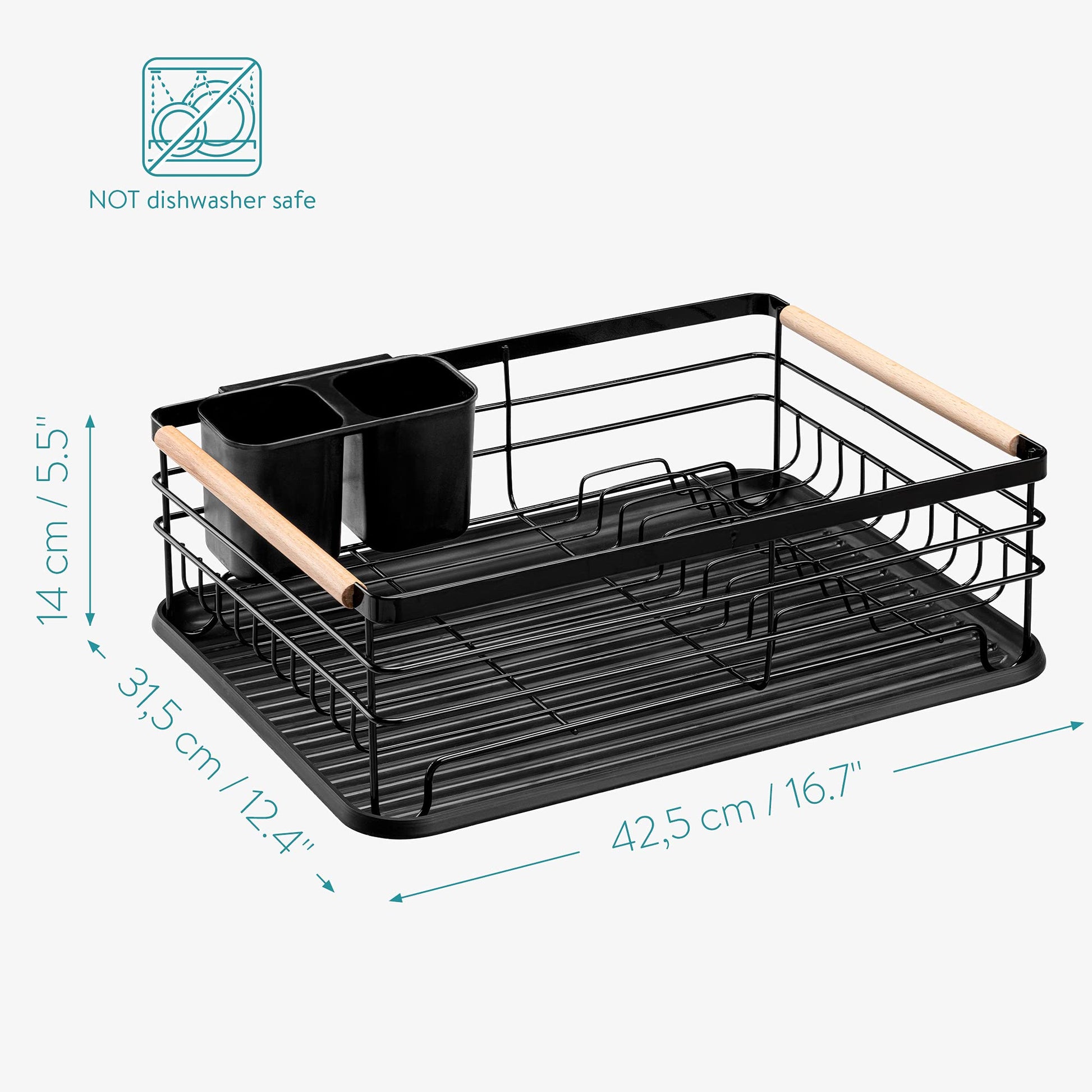 • SPECS: Measurements - 42.5 x 31.5 x 14 cm (16.7 x 12.4 x 5.5 inches). You will receive 1x rack, 1x drip tray and 1x removable cutlery holder. This drying rack is made of beechwood, plastic and iron.