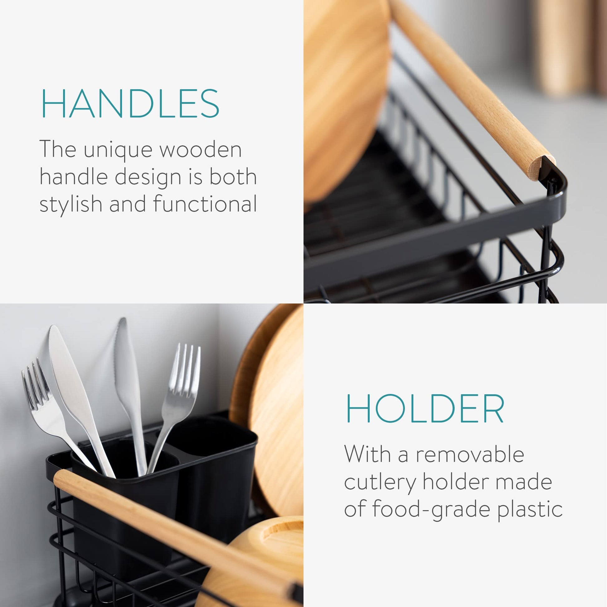 • EASY TO CARRY: The drying rack can be easily removed from the drip tray. So, you can transport your dry dishes to a more convenient place in order to place them in storage. And the wooden handles make it easy to carry.