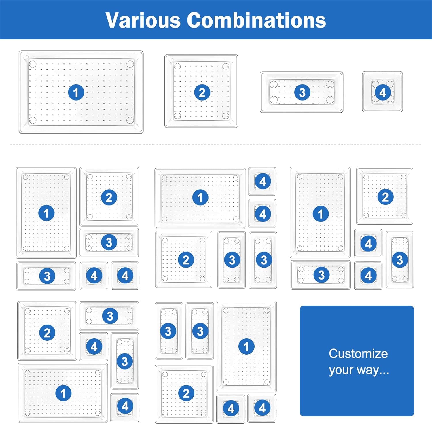 • Multiple Sizes - 4 different sizes and 7 pieces trays offer you customize combinations to store stuff and organize drawer for your specific needs. Size: 6 x 9 x 2 inches (1 pack), 6 x 6 x 2 inches(1 pack), 3 x 6 x 2 inches(3 pack), 3 x 3 x 2 inches(2 pack)