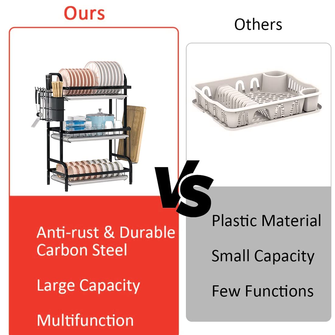 • Large Capacity: Almost all of your daily usage utensils will fit easily in this dish rack. The first tier holds up to 16 plates. You can put cups, mugs and pans in the second tier to dry. The bottom tier can fit 18 bowls. There is a cutting board holder, cutlery holder and hooks for some cooking spoons and more.