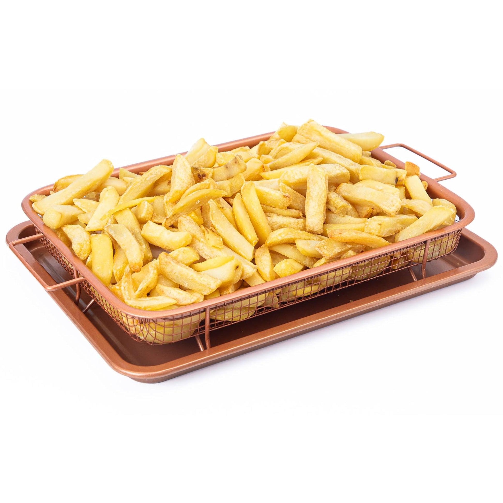 • Your 2 piece air copper crisper tray has an elevated mesh crisping basket that allows super-heated air to pass through and circulate a full 360 degree around the food ensuring it's cooked evenly ensuring your food will not overcook or dry out.