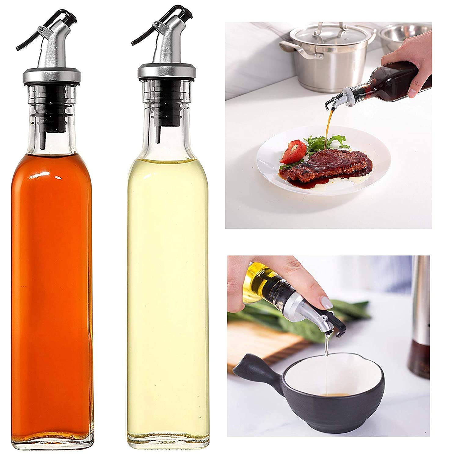 Oil and Vinegar Dispenser Bottle, Leak Proof with Stainless Steel Stopper, 500ml Clear Glass Bottle, Set of 2 - Perfect for Home and Restaurant