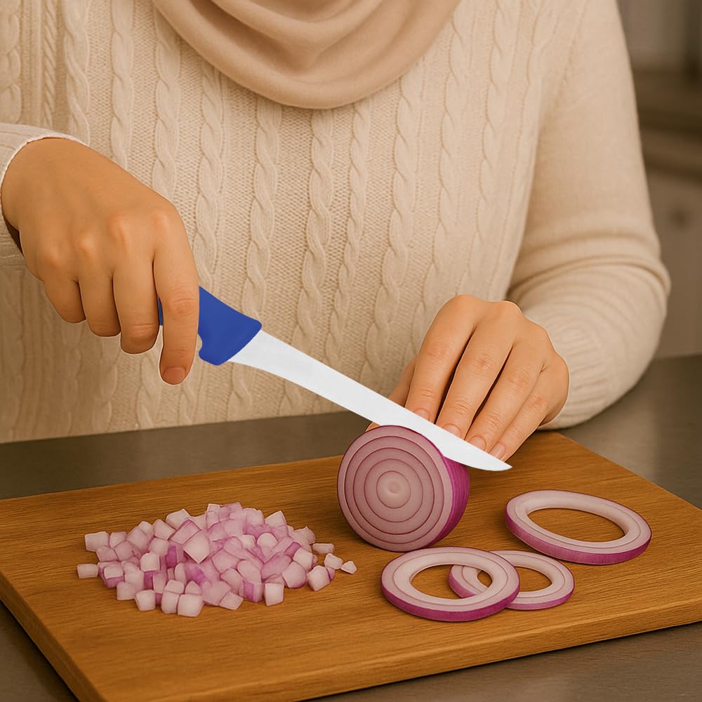 • Sharp stainless steel blade retains its edge longer, making it ideal for slicing, dicing, chopping, and a variety of everyday kitchen tasks.