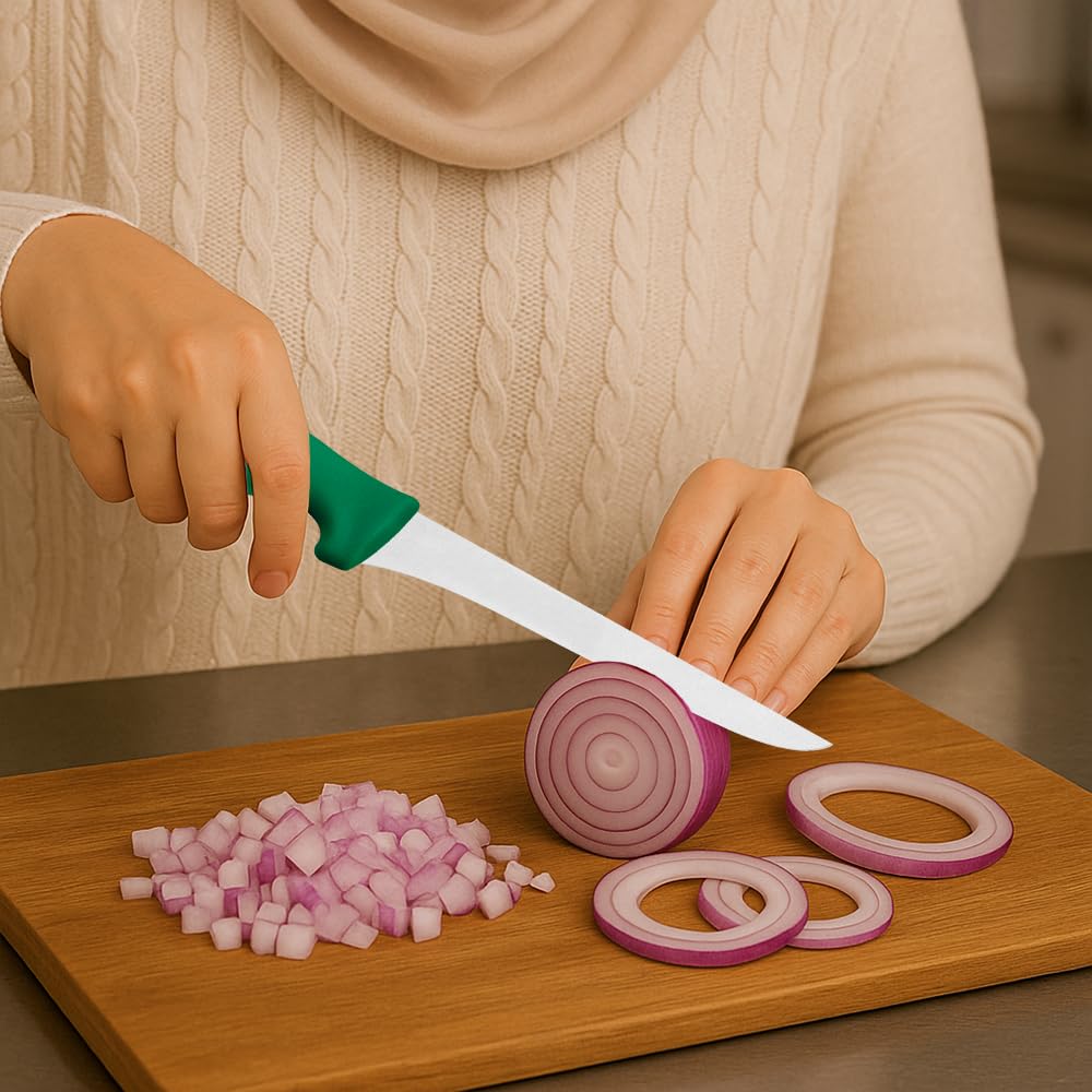 • Sharp stainless steel blade retains its edge longer, making it ideal for slicing, dicing, chopping, and a variety of everyday kitchen tasks.