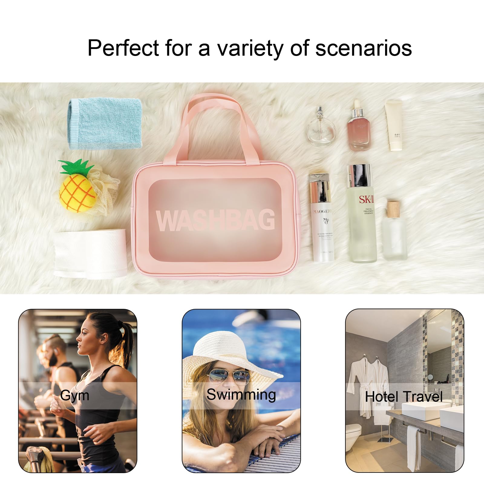 Qupzsen Travel Toiletry Bag for Women and Men - Matte Translucent Bag with Handy Handle - Makeup Cosmetic Organizer for Travel Toiletries Accessories, Pink, 3